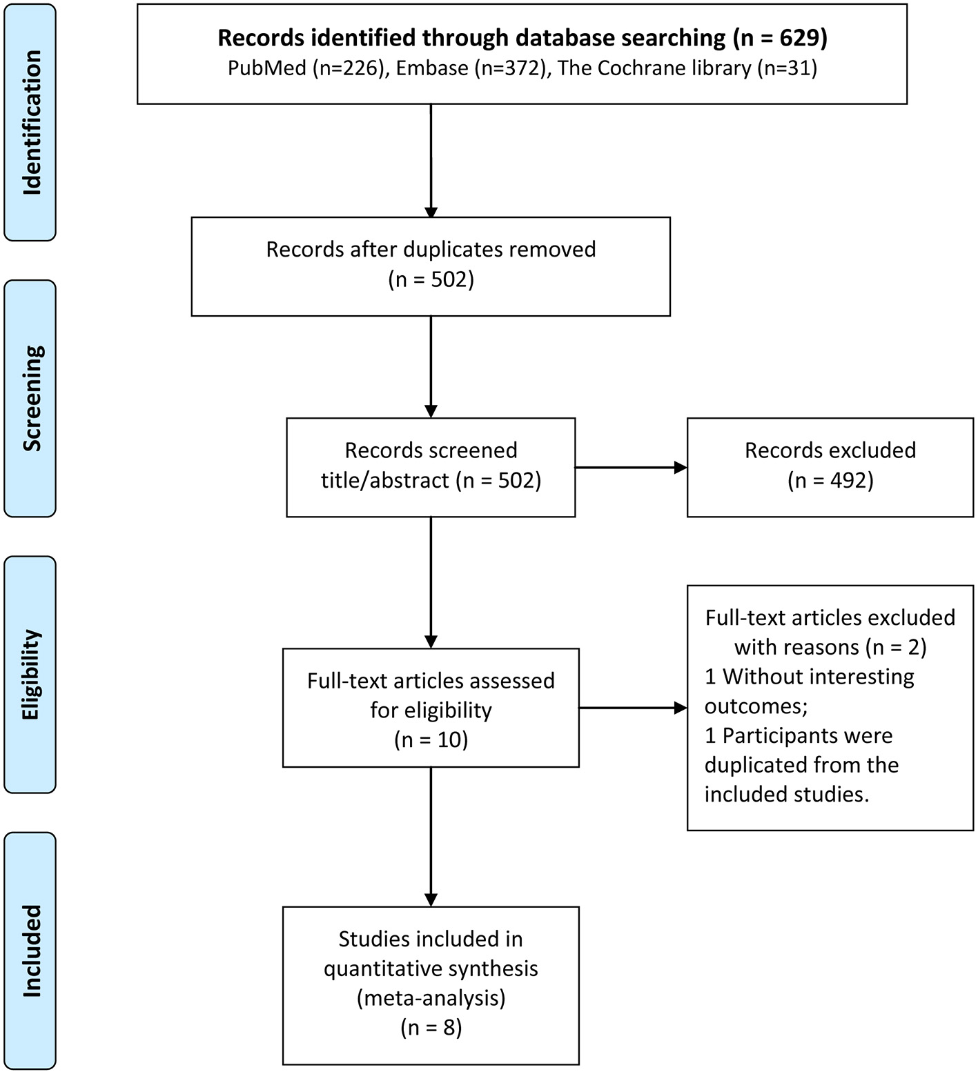 The results of the literature search and the literature screening process are shown in Figure 1. Full-text documents were retrieved for 629 articles (226 in PubMed, 372 in EMBASE, and 31 in Cochrane) from electronic databases for meta-analyses. No additional eligible study could be identified in the reference lists of included studies. After eliminating 127 duplicate articles, 502 studies were obtained in the initial screening. Of these, 492 irrelevant articles were excluded by reviewing their titles and abstracts. Then, 10 articles were subjected to full-text evaluation. Finally, 8 cohort studies (16–19, 24–27) were selected for the analysis.