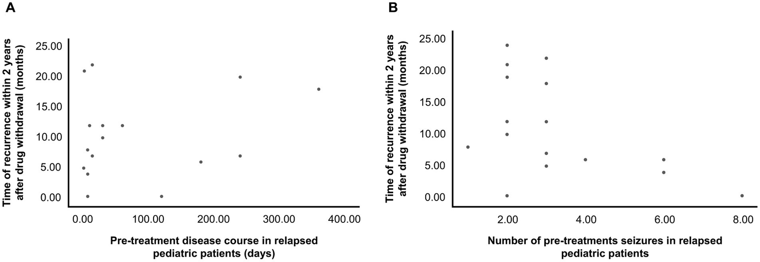 (A) Relationship between pretreatment disease course and time of postwithdrawal recurrence in the relapse group. Three points with high deviation were excluded from the figure. (B) Relationship between pretreatment seizure frequency and time of postwithdrawal recurrence in the relapse group. Nineteen patients had a relapse. In the figure, an overlap occurs between two pediatric patients, and two points of high deviation were excluded.