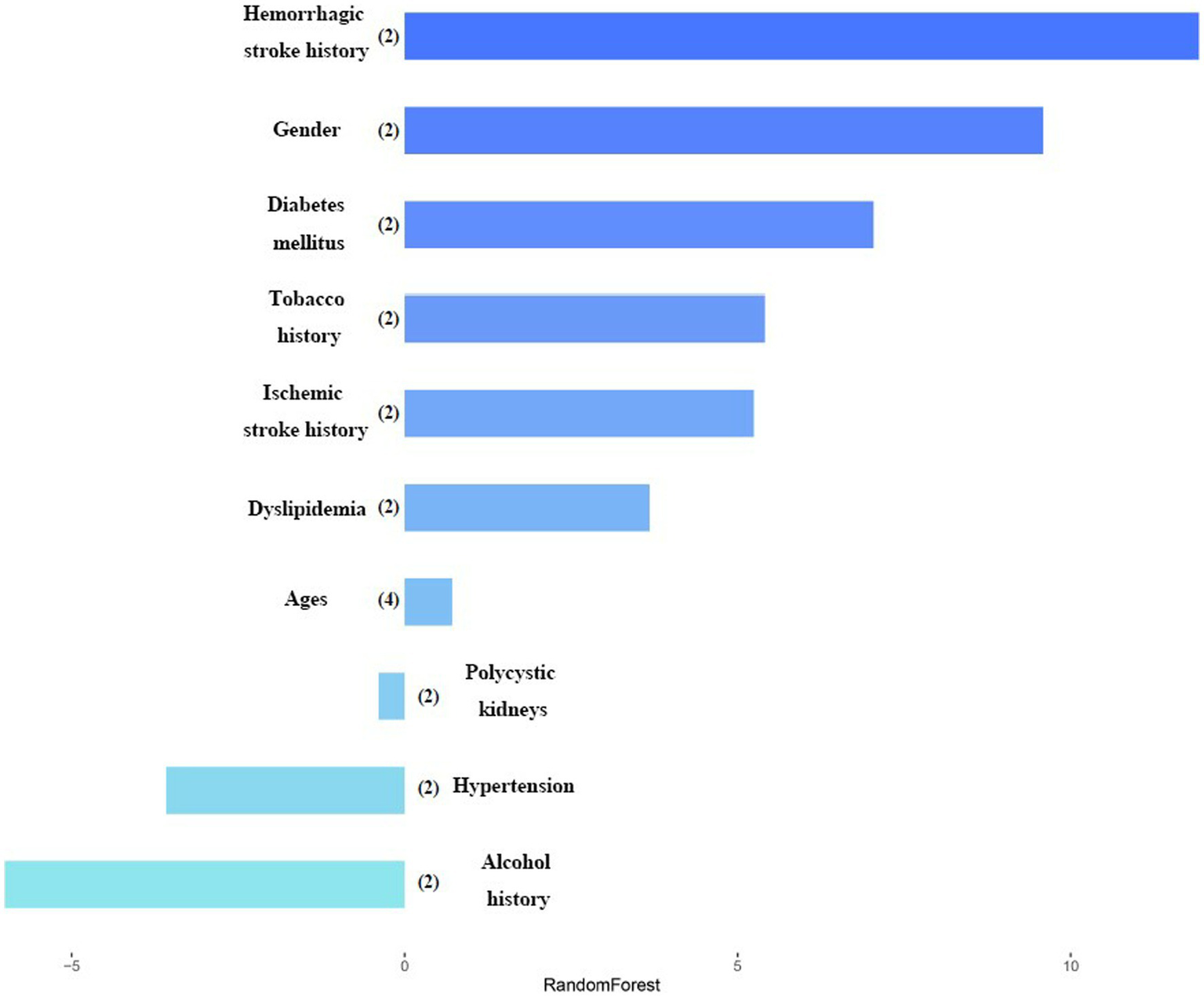 In the ruptured group (84.8%) of 1,124 cases and the unruptured group (15.2%) of 201 cases, the multivariable logistic regression (MLR) model shows hemorrhagic stroke history (OR 95%CI, p:0.233 (0.120–0.454),<0.001) and the age stratification of 60–69 years (OR 95%CI, p:0.425 (0.271–0.668),<0.001) has a significant statistic difference. In the RandomForest (RF) model, hemorrhagic stroke history and age are the best predictive factors.