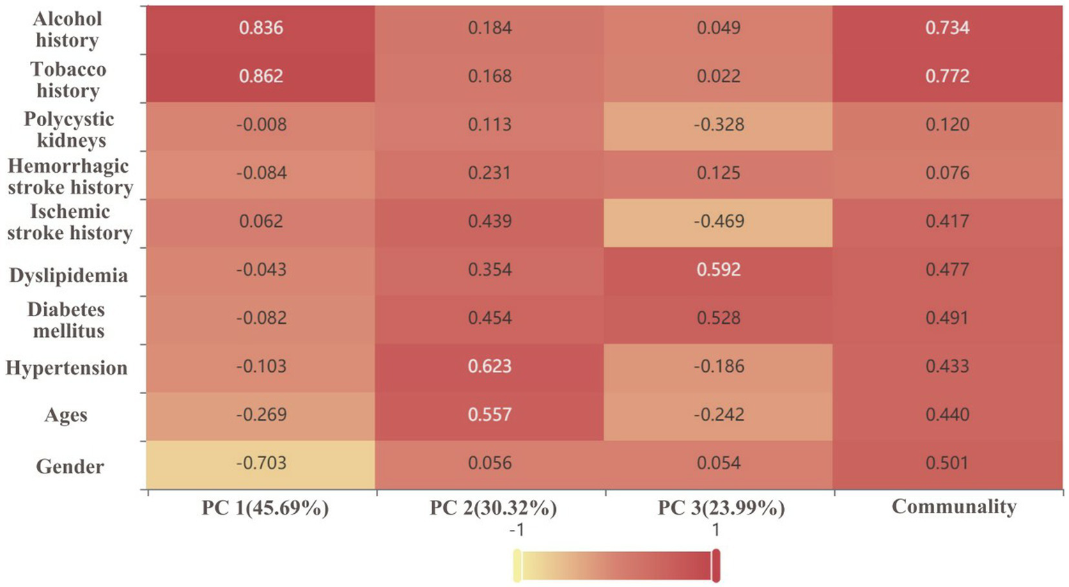Secondly, MLR does not entirely rule out collinearity between predictor variables and in turn interferes with the conclusions about the level of influence of predictor variables on whether a single ACoA ruptures or not. Therefore, we used principal component analysis (PCA) to downscale the original predictor variables into a new set of several mutually uncorrelated synthetic variables, from which a few fewer sum variables could be taken out based on the practical needs to reflect as much information as possible about the original variables. PCA is to retain the new features that are most likely to reconstruct the original features, thus achieving the effect of dimensionality reduction of the data. The results of the final 1,325 cases were visualized in three-dimensions to aid the prediction (6, 14).