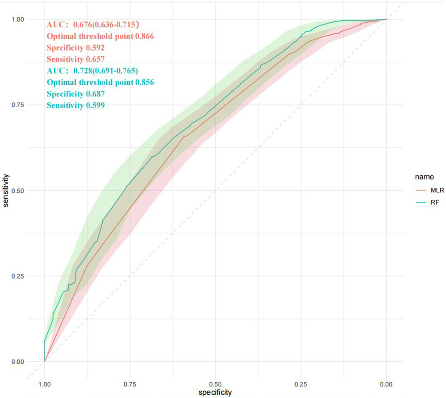 Finally, receiver operating characteristic (ROC) curve was used to evaluate the predictive ability of MLR and RF models. The sensitivity and specificity of each model in predicting the risk of a single ACoA rupture were obtained by graphically combining sensitivity and specificity and using the maximized Uden index to determine the cut-off point (7, 17).