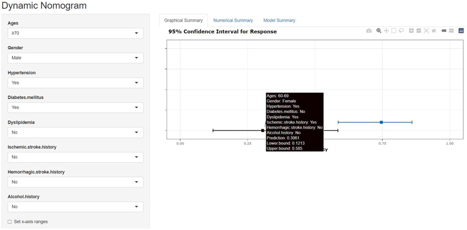 As for the results, a nomogram was used as a visualization tool to give it predictive modeling capability by setting up a training set and a test set. It used multiple clinical risk factors, assigned a score to each risk factor at each value level, then added up the individual scores to obtain a total score, and finally calculated the individual’s single ACoA rupture predictive probability by the function transformation relationship between the total score and the occurrence probability of a single ACoA rupture. The nomogram makes the results of the prediction model more readable and has higher use (13, 15, 16).