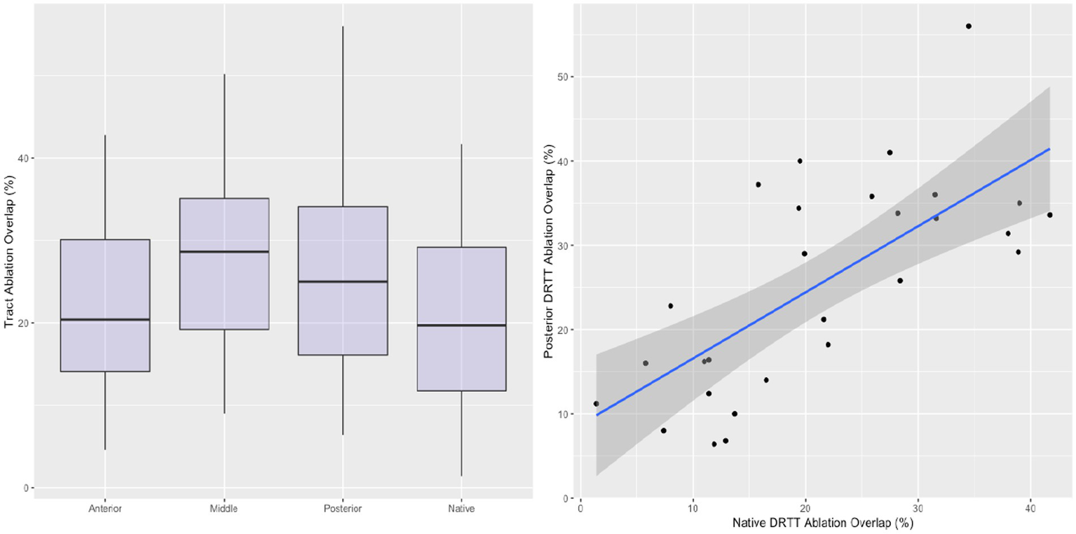 Figure 3. Boxplots displaying the ablation overlap for the native DRTT and 3 template DRTT clusters (left). Correlation between the ablation overlap between the native DRTT and the posterior template DRTT (right). Line of best fit indicated by blue line, and 95% confidence interval indicated by shaded region.