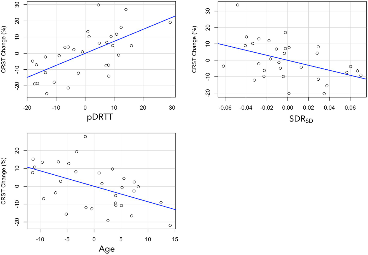 Figure 4. Partial plots from multivariate regression with CRST change as dependent variable for pDRTT (top left), SDRSD (top right) and age (bottom left). All variables are mean centred.