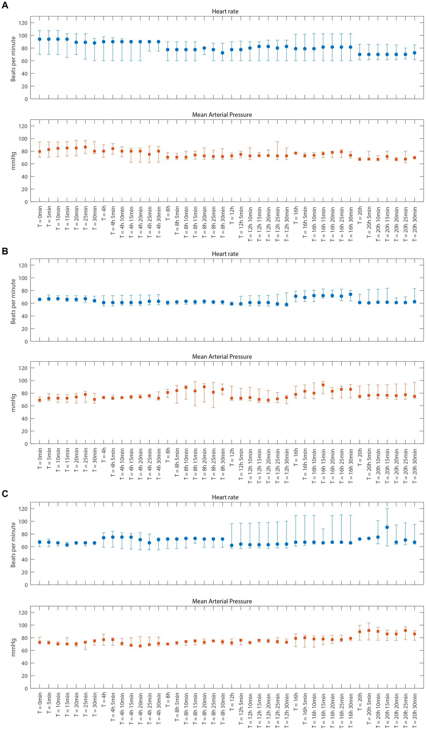 In total, eight patients died (four in cohort A, one in cohort B, and three in cohort C), which was reported as an SAE to the DSMB and regulation authorities. In all cases, the SAE was judged as not related to the study medication. One patient in cohort A suffered another cardiopulmonary arrest, consisting of bradycardia with loss of circulation. This patient was still in the ICU, and CPR was performed immediately and successfully. This SAE occurred more than 24 h after the last administration of the study drug. In cohort B, one patient woke up very agitated after sedative drugs were stopped. It was decided to extubate the patient to see if this affected the agitation. As no improvement occurred, sedative medication had to be restarted which necessitated reintubation and mechanical ventilation for another 24 h. Finally, in cohort C, one patient was readmitted to the hospital after discharge because of shortness of breath and cystitis with urinary retention. This occurred within 30 days after inclusion in the study and was scored as an SAE. After treatment with diuretics and antibiotics, the patient recovered rapidly. These three SAEs were also judged as not related to the study medication.