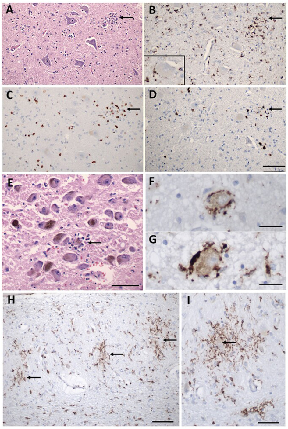 Inflammatory pathology in COVID-19 brains. (A) Section of the hypoglossal nucleus shows several motor neurons and a microglial module (arrow). (B) An adjacent section stained for CD68, showing clustered microglia in the nodule. Inset: Microglia in close apposition to a hypoglossal neuron (CD68). (C) An adjacent section stained for CD3, showing scattered T cells in the tissue and associated with the microglial nodule. (D) An adjacent section stained for CD8 showing that many of the T cells are CD8 +. (E) The locus coeruleus contains a microglial nodule with a degenerating neuron in the center, identified by its residual neuromelanin (arrow). (F, G) Neurons of the dorsal motor nucleus of the vagus surrounded by CD68 + microglia. (H, I) Microglial nodules in the dentate nucleus (arrows inH), neuron in the middle of a nodule (arrow inI), CD68. Scale bar in (D) = 200 μm for (A–D); in (E) = 10 μm; (F, G) = 50 μm; (H) = 100 μm; (I) = 50 μm. Adapted from Thakur et al. (9) (License Number 5472500477340).