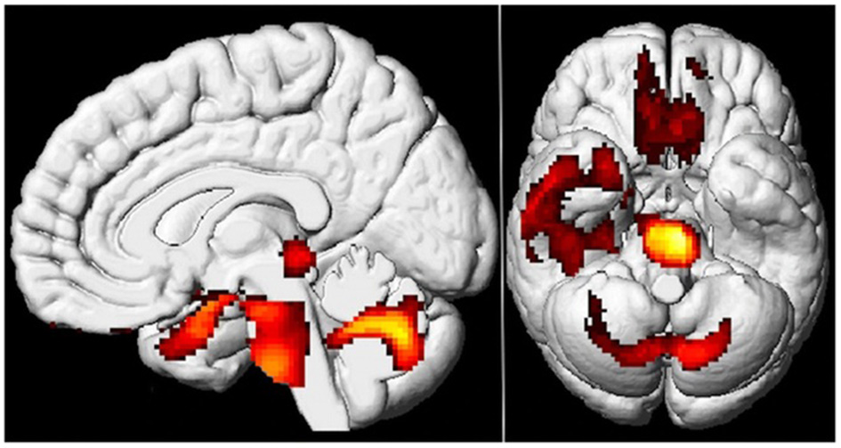Brain 18F-FDG PET hypometabolism in patients with long COVID. In comparison to healthy subjects, the patients exhibit hypometabolism in the bilateral rectal/orbital gyrus, including the olfactory gyrus; the right temporal lobe, including the amygdala and the hippocampus, extending to the right thalamus; the bilateral pons/medulla brainstem; the bilateral cerebellum (p-voxel < 0.001 uncorrected, p-cluster < 0.05 FWE-corrected; SPM8 3D rendering). Adapted from Guedj et al. (45) (License Number 5474900644082).