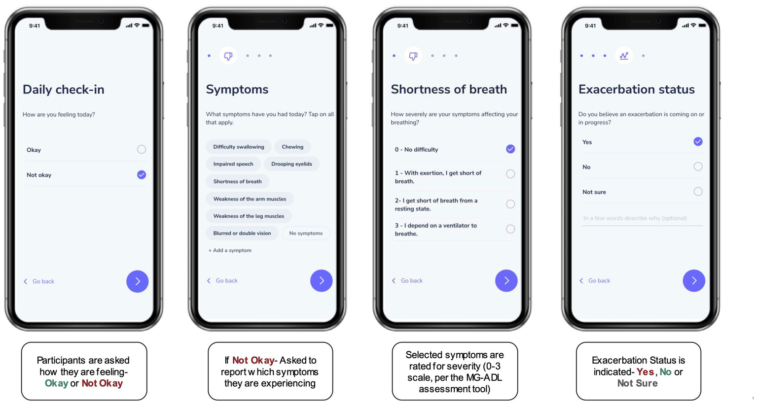 The “Daily Check-In” as a digital, self-reported outcome measure. Participants were asked to complete a Daily Check-in using the research application for the study, to self-report on symptoms and symptom severity (on a scale from 0–3) using a digital version of the MG-ADL assessment. In addition, each check-in prompted participants to indicate if they thought a symptom exacerbation was in progress by selecting “Yes,” “No,” or “Not Sure.”