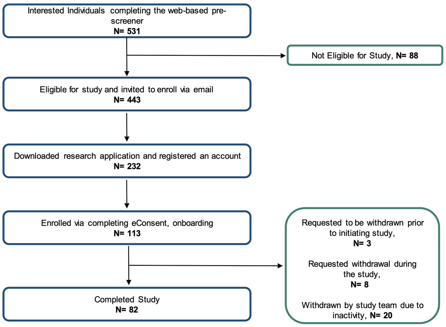 Adherence to study tasks was monitored on a weekly basis and participants who were below the target threshold (60% completion of total available study tasks) were sent automated reminder emails to re-engage with the study. After 3 consecutive reminders for inactivity, participants would be flagged for review and additional outreach by the study team. Participants who were non-responders to the outreach were withdrawn from the study.