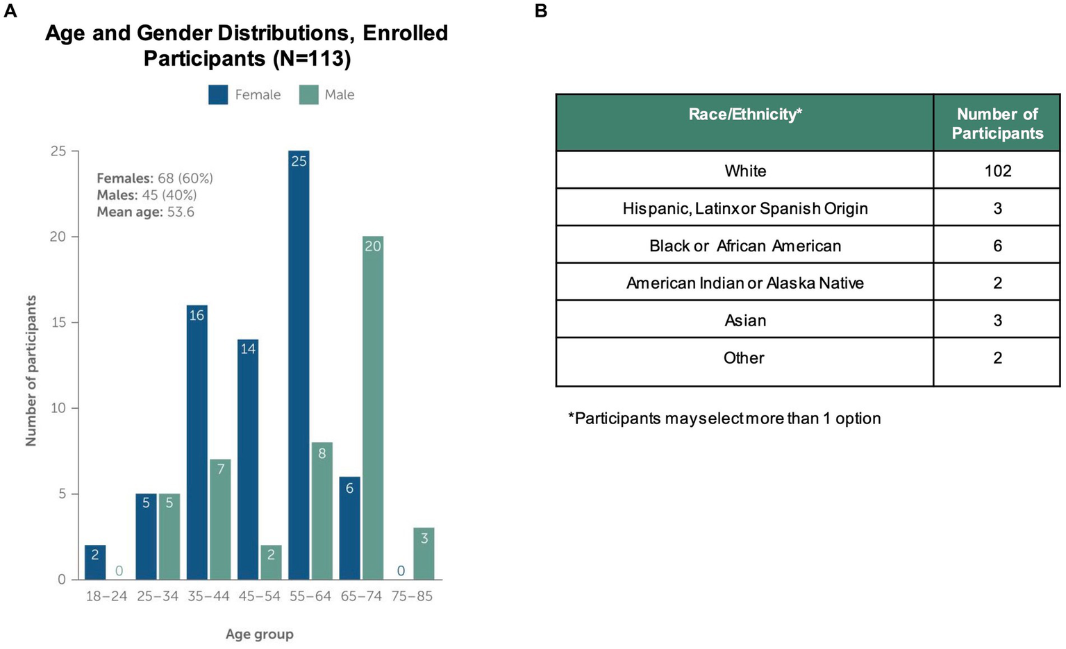 Study Population Characteristics. The study enrolled and onboarded 113 participants. The upper panels in the figure show (A) distribution of study participants by age, gender and (B) distribution of participants by self-reported Race/Ethnicity. Note that participants could select more than one race/ethnicity with which they identified.