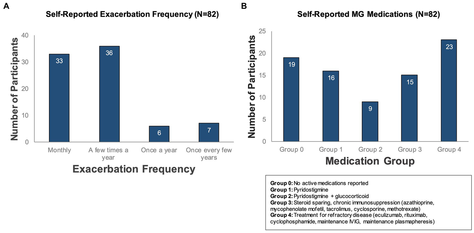 Self-reported exacerbation frequency and MG medications. Participants who completed the study (N = 82) were classified according to (A) how often they experienced symptom exacerbations (as reported in a baseline survey administered during onboarding) and (B) self-reported active medications for treatment of MG.