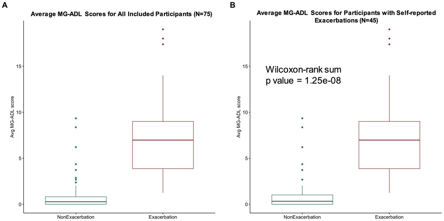 Median MG-ADL scores averaged per participant during self-reported exacerbation and non-exacerbation periods were 7 (interquartile range 4–9, range 1–19) and 0.3 (interquartile range 0–0.8, range 0–9), respectively for our study population of interest (N = 75) (Figure 5A). A total of 45 participants reported MG exacerbations, with an average of 6.3 exacerbation days per participant over the 90 day study period. A significant association between average MG-ADL scores and exacerbation status was observed for this sub-cohort (Wilcoxon signed-rank value of p = 1.25e-08) (Figure 5B).