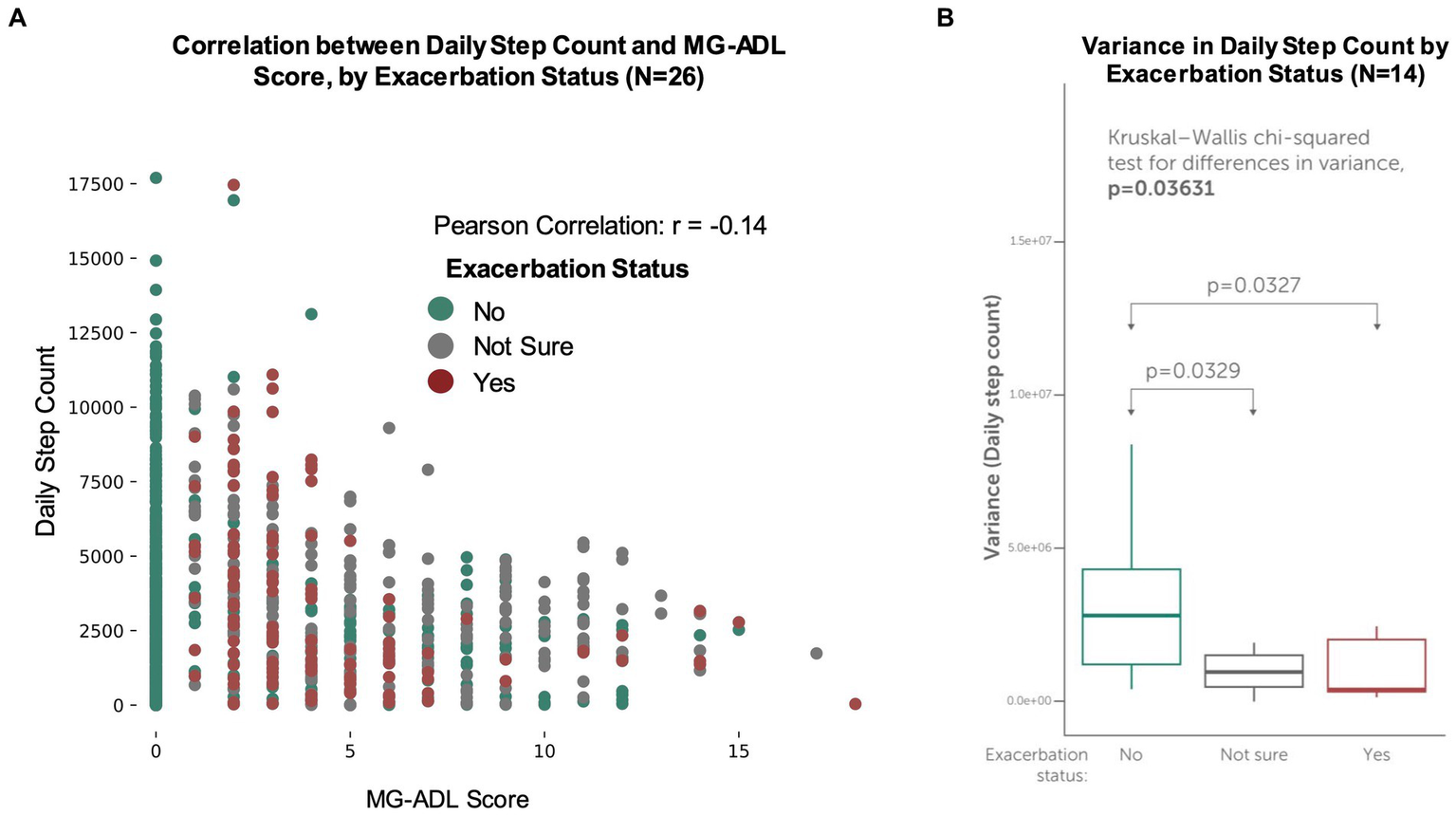 For participants who contributed daily step count data (N = 26), differences in step counts during non-exacerbation and exacerbation periods were examined. Interestingly, for all participants with step counts, a weak negative correlation (Pearson correlation coefficient r = −0.14) between daily step count and MG-ADL score was observed (Figure 6A). For the participants who contributed daily step count data and reported exacerbations during the study (N = 14), a statistically significant difference between variance in average daily step count and exacerbation status was observed (Kruskal Wallis value of p = 0.03) (Figure 6B). This suggests that patients who reported exacerbations took fewer steps on exacerbations days, as compared to non-exacerbation days.