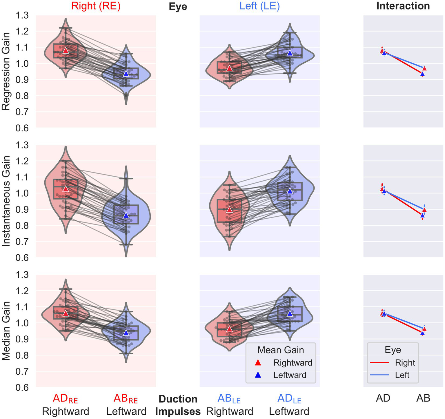A repeated-measures study design with three within factors, each with two levels, was used: duction (ABduction, ADduction), eye (left, right), and repetition (test, retest). Continuous normally distributed data are reported as mean (SD), with standard deviation in parentheses. Indices are reported as median (IQR), with interquartile range in parentheses. Statistical computations were conducted with JASP (JASP Team, 2022), Python (Version 3.9) with Pandas (Version 1.3.2), and R (R Core Team, 2022). All metrics were tested for normality by visual inspection of qq plots and subsequent Shapiro–Wilk testing. Levene’s test was used to verify variance homogeneity. Differences and interactions in VOR gains between factor levels were assessed with a repeated measures analysis of variance (ANOVA). Both frequentist and Bayesian analyzes were performed for repeated measures ANOVA. For frequentist analyzes, p < 0.05 was considered statistically significant. Separate tests were performed for the metrics instantaneous gain, median gain, and regression gain.