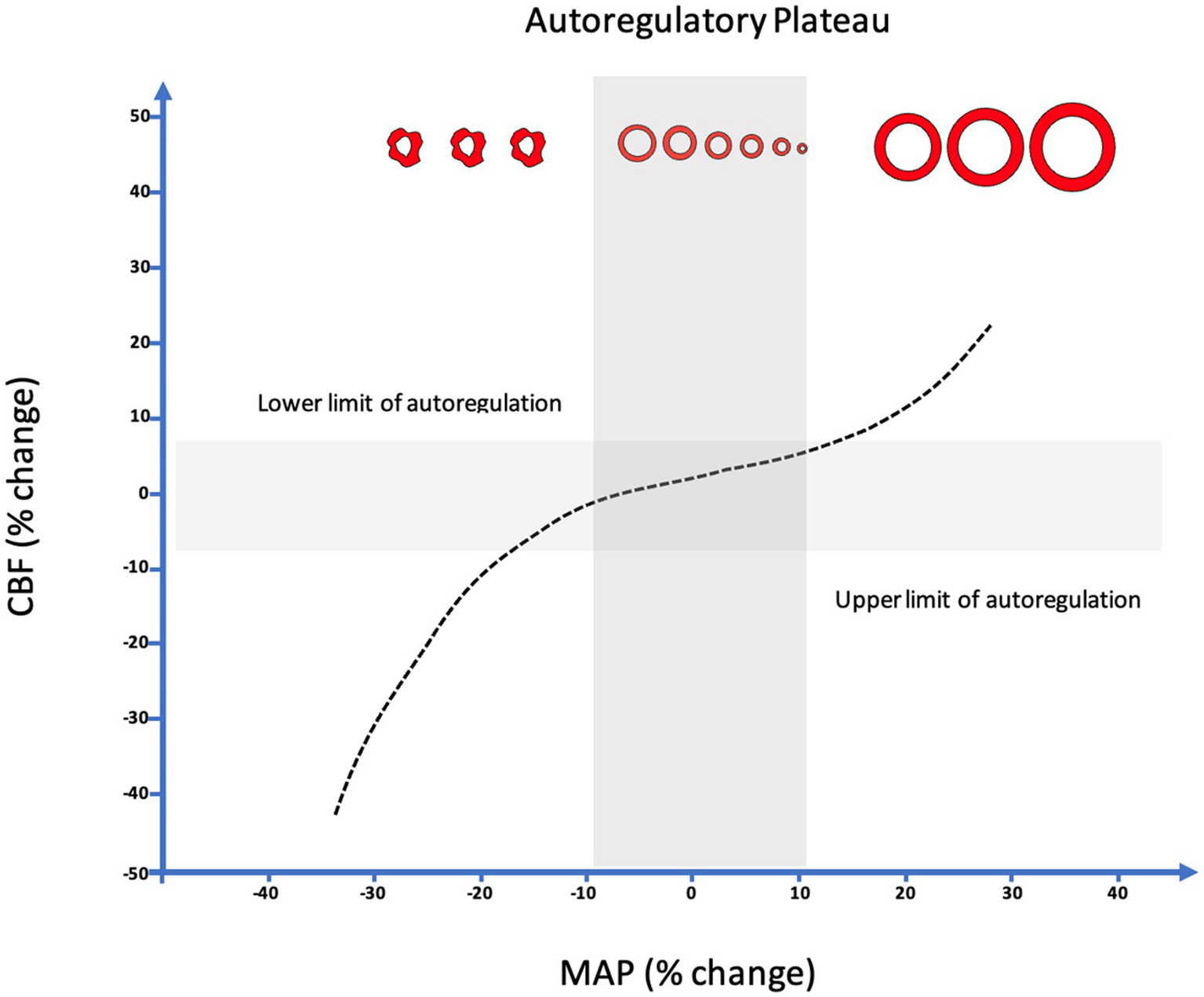Relationship between changes in MAP from baseline (Δ%MAP) and concomitant relative changes in CBF (Δ%CBF). Upper and lower limits of autoregulation demonstrated by linear correlation between MAP and CBF indicative of pressure passive state. NB. The classic Lassen’s curve demonstrating a wide range of autoregulation (~50–150 mm hg) has been challenged. It is suggested that a narrow range of autoregulation (~15–200 mm hg) is likely to be more common, even in healthy individuals, and is influenced by the rate of arterial pressure changes.