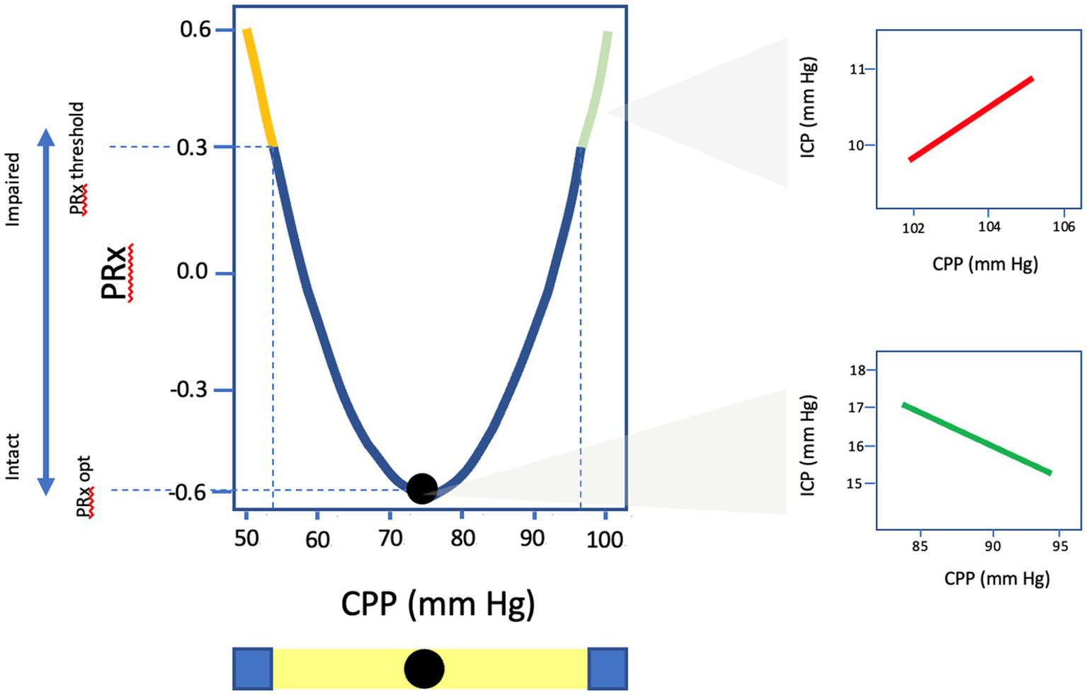 Graphic representation of U-shaped curve of PRx values as a function of CPP. CPPopt identified as the CPP value with the lowest associated PRx and most optimal autoregulatory state. PRx, pressure reactivity; CPP, cerebral perfusion pressure; ICP, intracranial pressure.