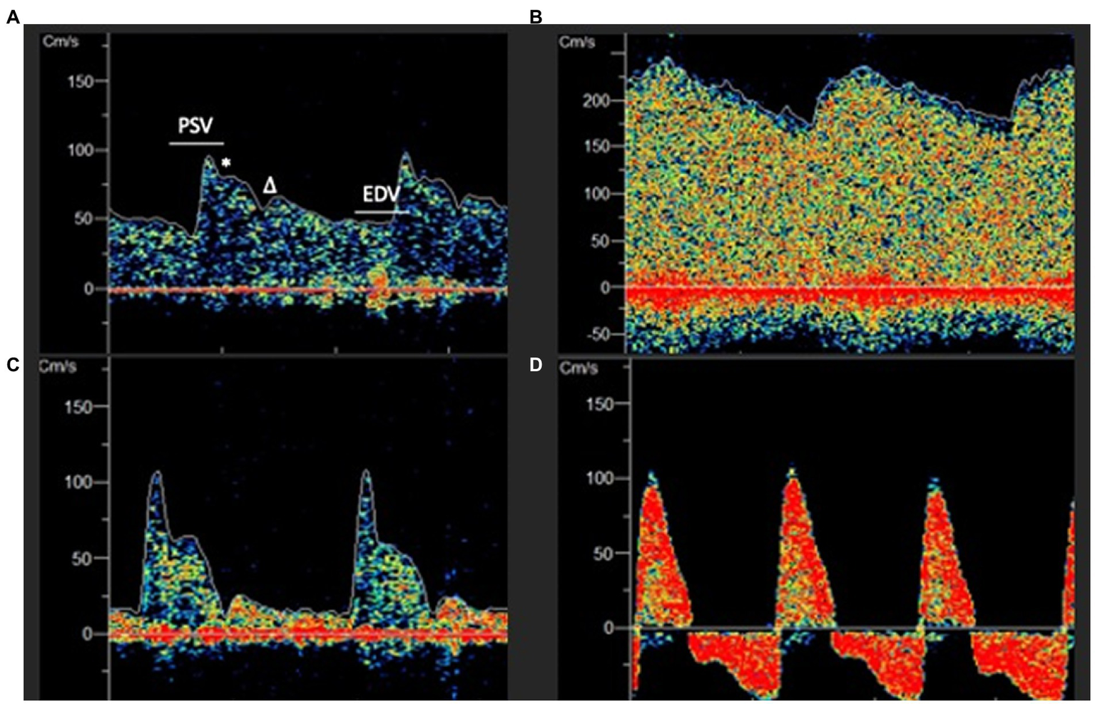 (A) Normal appearing low resistance TCD waveform. PSV, Peak systolic velocity; EDV, End Diastolic Velocity; * Windkessel Notch; Dicrotic Notch. (B) Hyperemic appearing waveform with elevated EDV, absent dicrotic notch and low pulsatility index (PI). (C) High resistance waveform with low EDV and elevated PI. (D) Extremely elevated intracranial pressure with peaked systolic upstroke and reversal of diastolic flow in a patient with cerebral circulatory arrest.