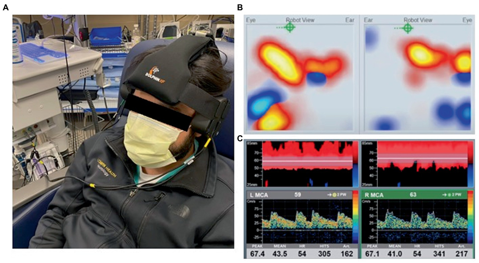 (A) Transcranial doppler (TCD) robotic headset placement. (B) Automated robotic scanning for intracranial vessel. (C) Continuous bilateral middle cerebral artery recordings with power M-mode and spectral doppler. Viasonix Dolphin/XF TCD Robotic Probe, Imaging Monitoring United States®.