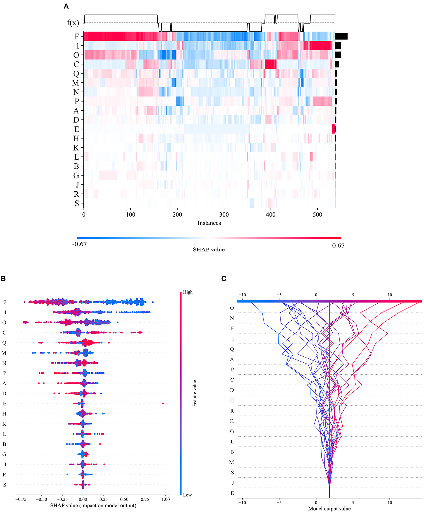 where n0 = ∑I(xi ∈ o), , and . (B) The XGBoost algorithm can generate a second-order Taylor expansion of the utilized loss function and obtain the optimal solution for the regular term outside the loss function (50, 51). The larger the weight of a feature and the more times it is selected by the boosted tree, the more important the feature is considered to be (52, 53). Suppose that the model has t DTs, n represents the total number of samples, ft represents the t-th regression tree, F represents the collective space of all DTs, and represents the total predicted value for the i-th sample after adding the outputs of the t DTs. Then, the predicted value of XGBoost (54) can be expressed as