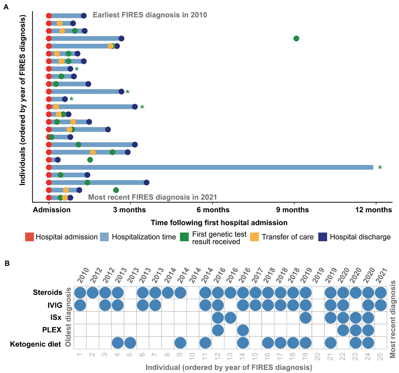 Clinical histories of 25 individuals with FIRES identified in the Electronic Medical Records (EMR), highlighting in (A) time at hospital admission and discharge in addition to transfer of care and time of first genetic test results received in the first year following first status epilepticus event. Individuals whose genetic testing results were received more than a year after first hospital admission are indicated with a green asterisk. (B) Overview of treatment strategies for each individual presenting with FIRES, ordered by year of FIRES diagnosis, showing common use of steroids and intravenous immunoglobulins (IVIG) and an increased use of immunosuppressants (ISx) and plasmapheresis (PLEX) after 2014.