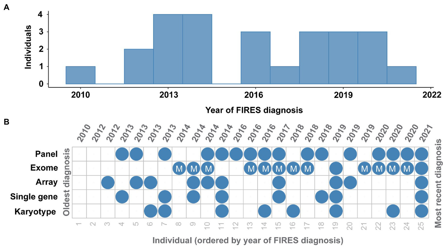 For individuals with confirmed diagnoses of FIRES, a comprehensive review of patient records was performed to identify elements of their diagnostic workup for FIRES, with particular attention to the timing and type of genetic testing. Previous genetic testing was identified in the EMR and stored as laboratory results, external media uploads, or within recent neurology and genetic clinical notes. Lastly, a free text search of medical charts was performed with the key words: “SCN2A,” “POLG,” “gene,” “karyotype,” “microarray,” “epilepsy panel,” “exome,” and “mito.” Cases where genetic testing was performed but reports were not available for review were noted. We documented the type of genetic test (single gene sequencing, karyotype, microarray, whole exome sequencing, mitochondrial genome sequencing), results, report date, coding and protein variant change, inheritance, and variant pathogenicity. Of note, genetic testing of individuals with FIRES spanned several years and tests were sent to and interpreted by different diagnostic labs, according to the discretion of the ordering provider. In the context of ongoing gene discovery, genes included on the gene panels have been variable depending on the year and may not have included more recently discovered genes.