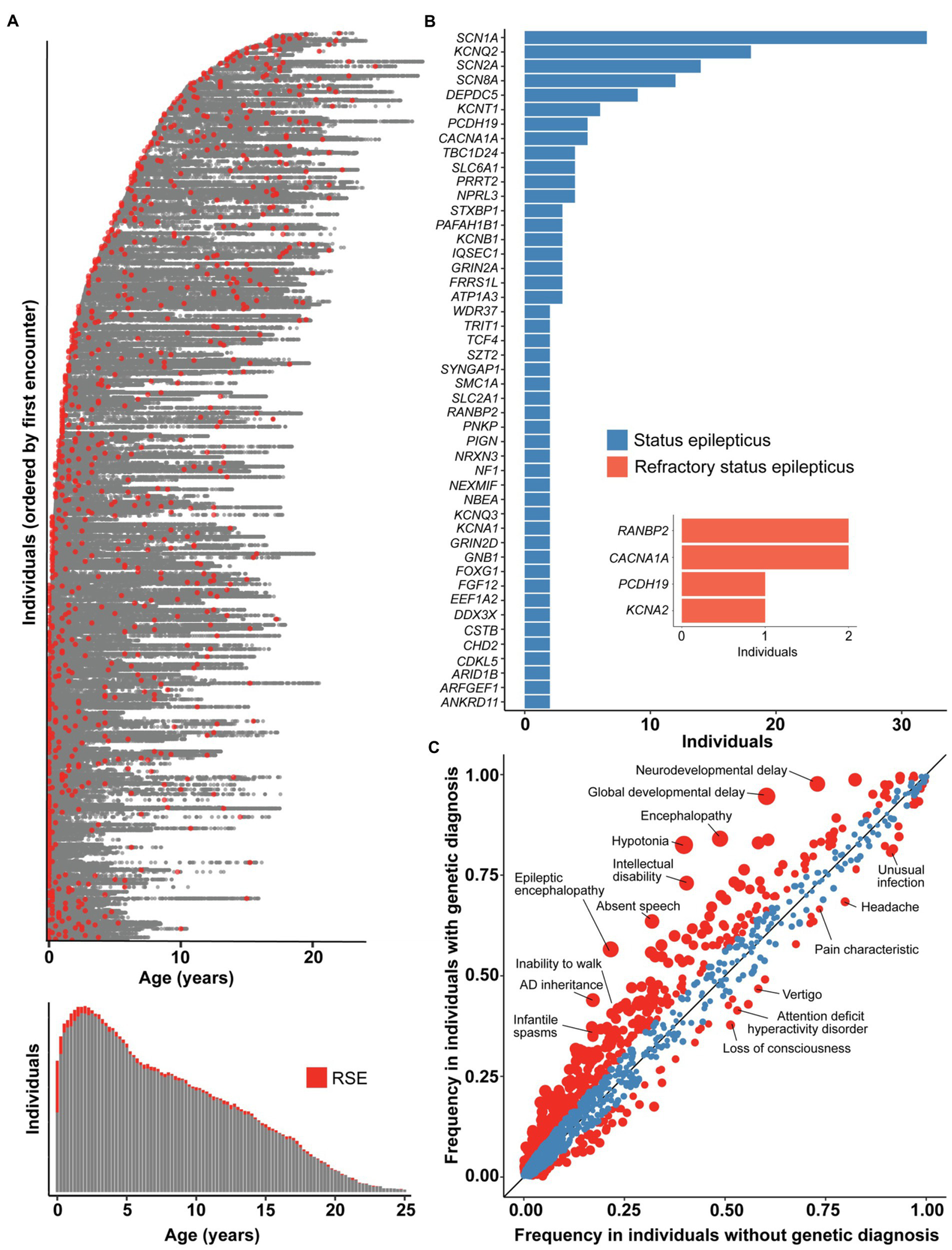 To characterize the clinical and genetic landscape of individuals with SE and RSE more broadly we used two cohorts: (1) 32,112 individuals with epilepsy in the Pediatric Epilepsy Learning Health System (PELHS) and (2) 1,894 individuals with presumed or confirmed genetic epilepsies at CHOP. First, using the PELHS cohort, we mapped the genetic and clinical landscape of non-FIRES RSE through systematic evaluation of the EMR, capturing more than 4.5 million full-text health care notes spanning 203,369 total patient-years. We limited our search in this cohort to the first presentation of RSE, as subsequent encounters with RSE documented in the patient notes could refer to a new RSE event or history of prior RSE. We assessed the overall distribution of RSE onset in this larger cohort and contrasted it with the wider distribution of onset in FIRES.