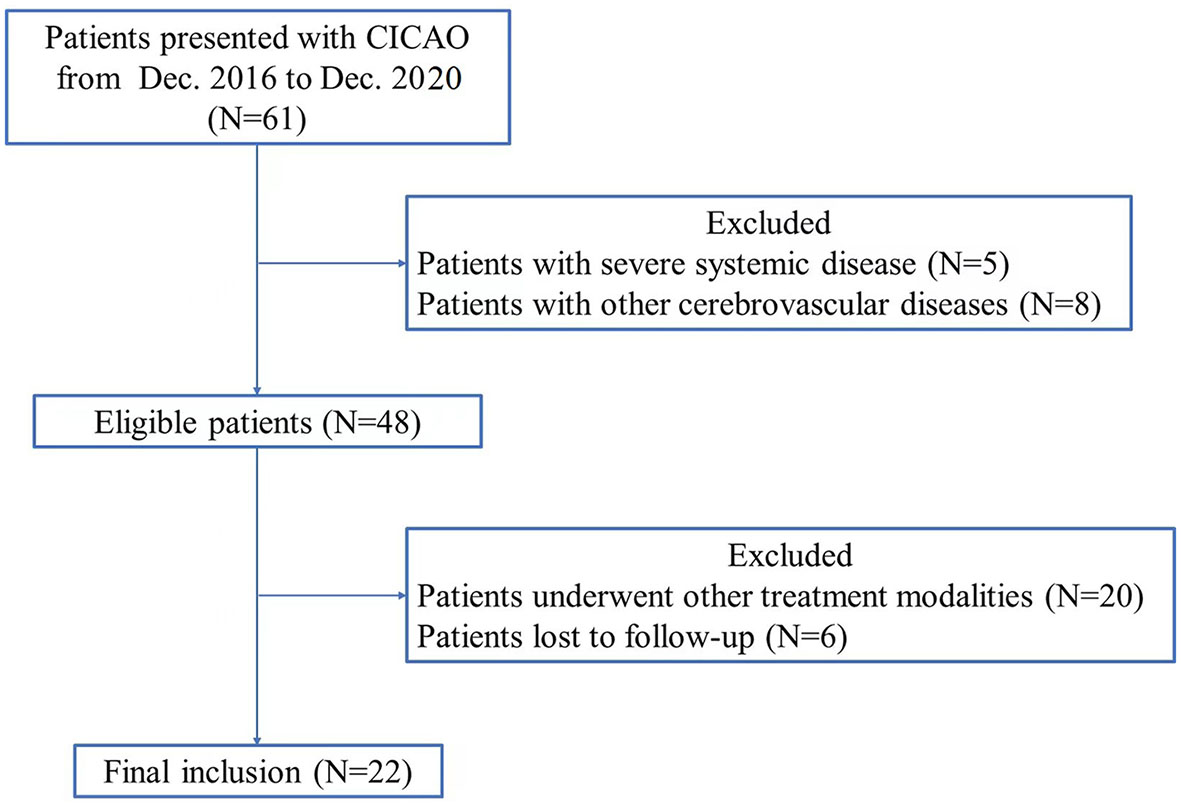 Exclusion criteria were listed as follows: (i) acute or subacute CICAO; (ii) other cerebrovascular diseases (Moyamoya disease, intracranial aneurysms, and cerebrovascular malformations) were excluded; (iii) the presence of severe systemic diseases in the heart, liver, kidney, lung, or other vital organs; (iv) inability to tolerate general anesthesia for surgery; and (v) patients who underwent other treatment modalities including pharmacological treatment, simple CEA or CAS recanalization, and intracranial and extracranial revascularization.
