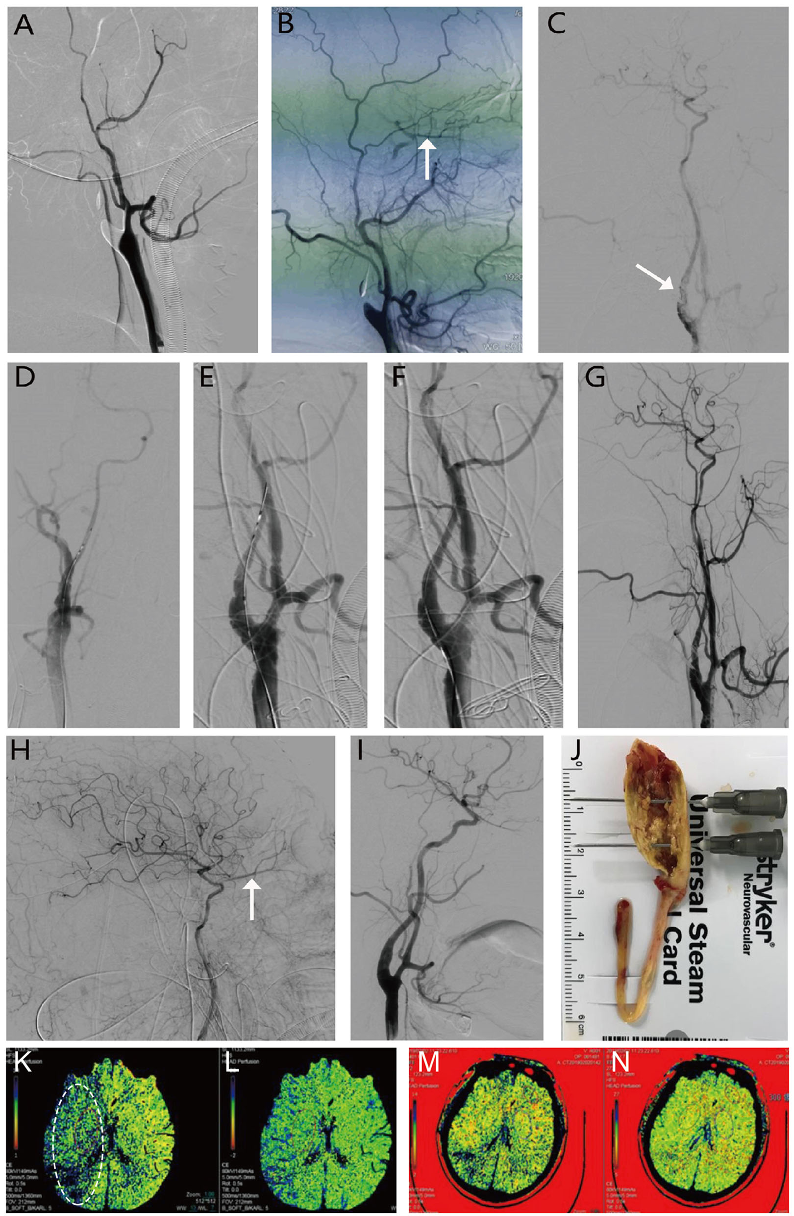 Procedure of open carotid endarterectomy (CEA) + internal carotid artery stent implantation (CAS) for right internal carotid artery occlusion. (A, B) Show occlusion of the right internal carotid artery, with (white arrow) indicating the backward opening of the ophthalmic artery, and the external carotid artery supplying blood to the internal carotid artery. (C) Shows that the internal carotid artery was open after CEA, but proximal stenosis is present (dashed white arrow) with poor intracranial perfusion. (D, E) Illustrate the procedure for CAS. (F–H) Show that after stent implantation, local stenosis is relieved, intracranial blood perfusion is significantly improved, and positive blood flow (white arrow) is restored to the ophthalmic artery. (I) Shows results of digital subtraction angiography at 6 months postoperatively. Further recovery of the vascular structure is observed without stenosis. (J) Shows intraoperative CEA with the removal of the internal carotid artery plaque and polarized thrombus, measuring ~10 cm. (K–N) Preoperative and postoperative perfusion CT. Compared with MTT in (K, white circle) and delayed TTP in (L) preoperatively, postoperative perfusion CT showed improvements in the (M) mean transit time (MTT) and (N) time to peak (TTP) after recanalization.