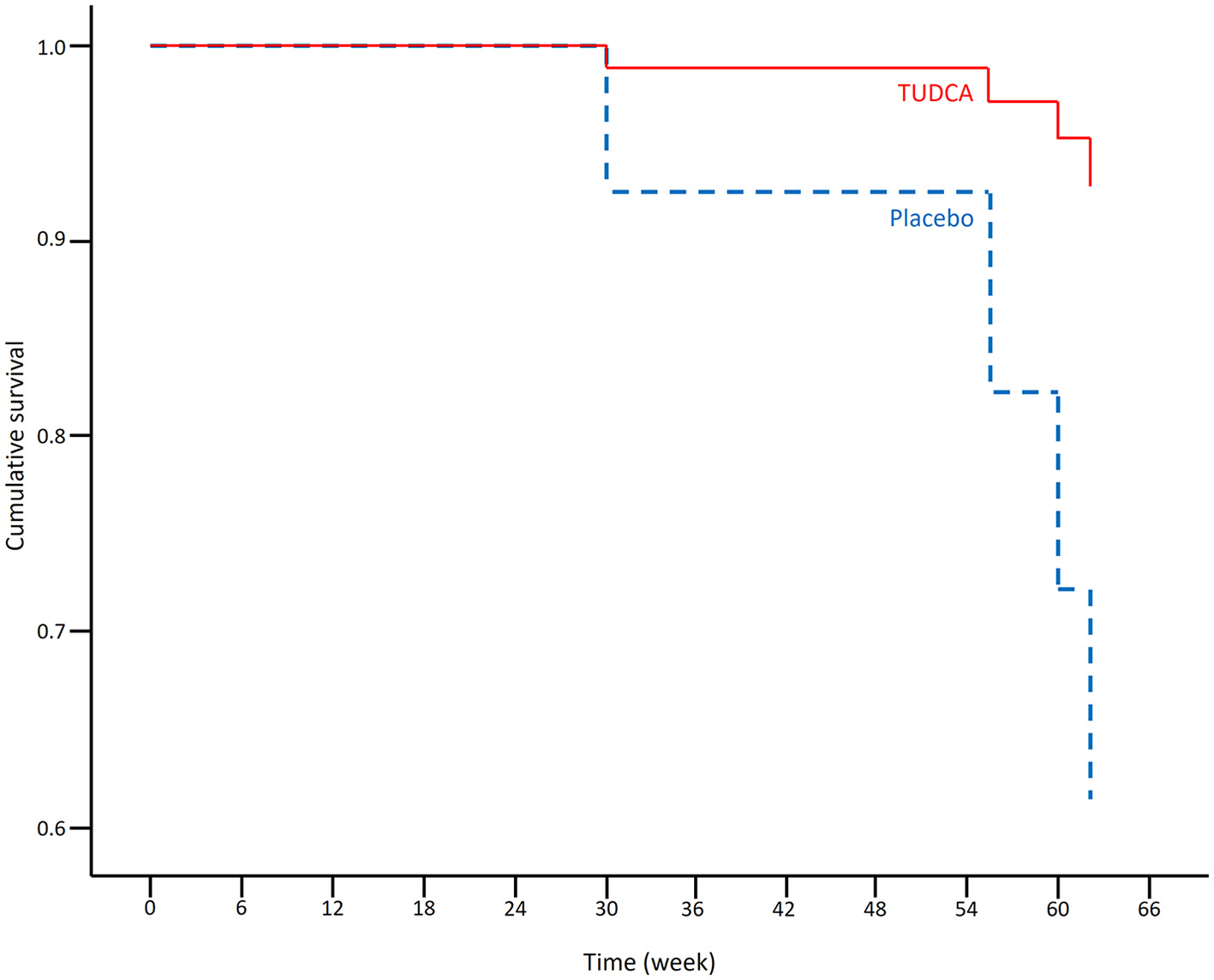 Cox regression survival plot estimating the probability of survival in the placebo (blue dashed line) and TUDCA (red solid line) arms (HR = 0.051, 95% CI = 0.002–1.059).
