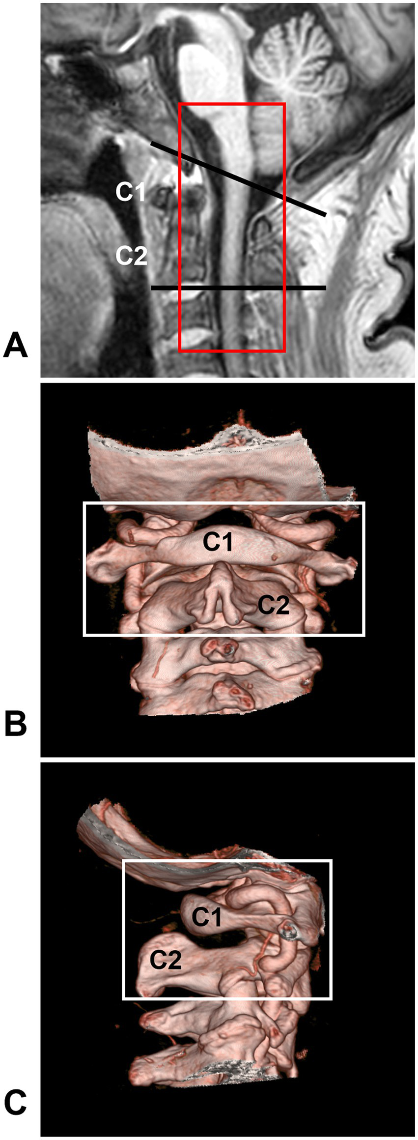 CCJ region definition. (A) MRI showing that the CCJ region was located between two black lines and formed by the occipital bone and C1-2 vertebrae. The red frame indicates the area often involved in CCJ AVF. (B,C) CTA showing the bony CCJ region (frames). AVF, arteriovenous fistula; C1-2, first and second cervical vertebrae; CCJ, craniocervical junction; CTA, computed tomography angiography; MRI, magnetic resonance imaging.