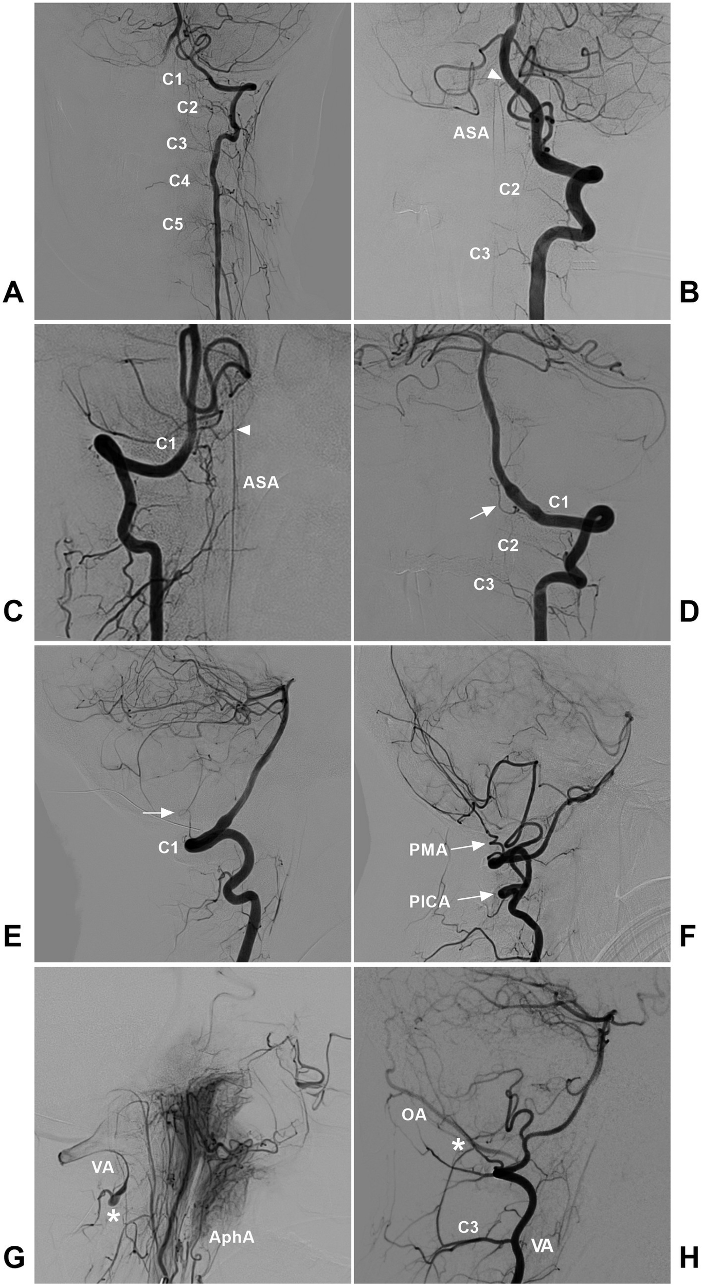 Arteries involved in the high cervical CCJ region. (A) DSA showing the radicular arteries from the VA at the C1-C5 levels. (B) DSA showing the ASA (arrowhead) from VA termination. The ASA had double trunks, and the radicular arteries of the C2-C3 levels could be seen. (C) DSA showing the ASA (arrowhead) originating from the C1 radicular artery. (D,E) DSA of anterior posterior (D) and lateral (E) views showing the C1 radicular artery (arrow). (F) DSA showing the extradural low PICA (PICA with arrow) and the PMA (PMA with arrow) from the VA. (G) DSA showing the anastomosis (asterisk) between the AphA and VA. (H) DSA showing the anastomosis (asterisk) between the OA and muscular branch of the VA. AphA, ascending pharyngeal artery; ASA, anterior spinal artery; C1-C5, first-fifth cervical vertebrae; CCJ, craniocervical junction; DSA, digital subtracted angiography; OA, occipital artery; PICA, posterior inferior cerebellar artery; PMA, posterior meningeal artery; VA, vertebral artery.