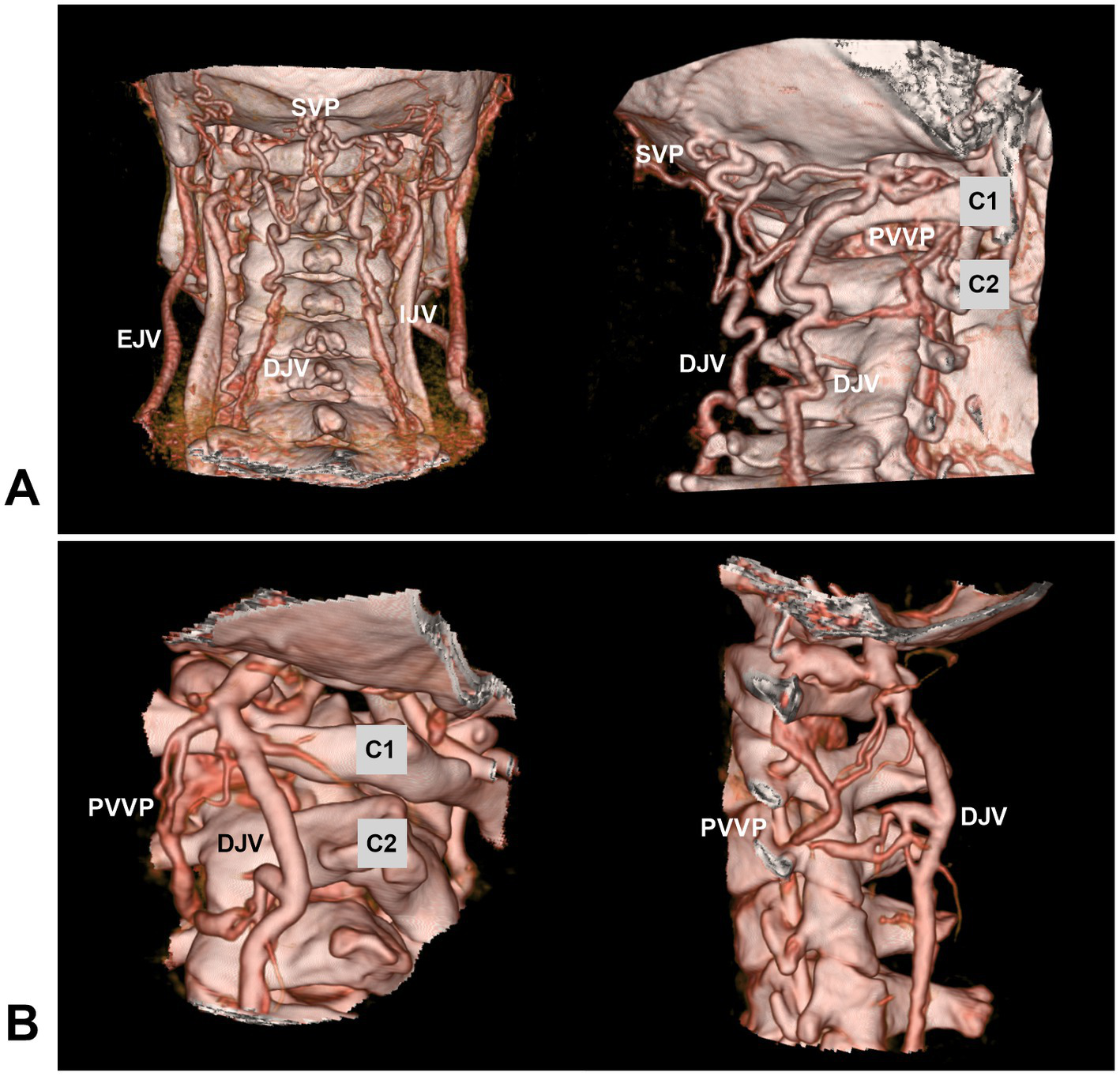 Venous plexuses in the CCJ region. (A) Posterior anterior view (left panel) and oblique view (right panel) CTA showing the anastomosed SVP, PVVP, and DJV. (B) Oblique view (left panel) and lateral view (right panel) CTA showing the anastomosed PVVP and DJV. C1, C2, first and second cervical vertebrae; CCJ, craniocervical junction; CTA, computed tomography angiography; DJV, deep jugular vein; EJV, external jugular vein; IJV, internal jugular vein; PVVP, paravertebral venous plexus; SVP, suboccipital venous plexus.