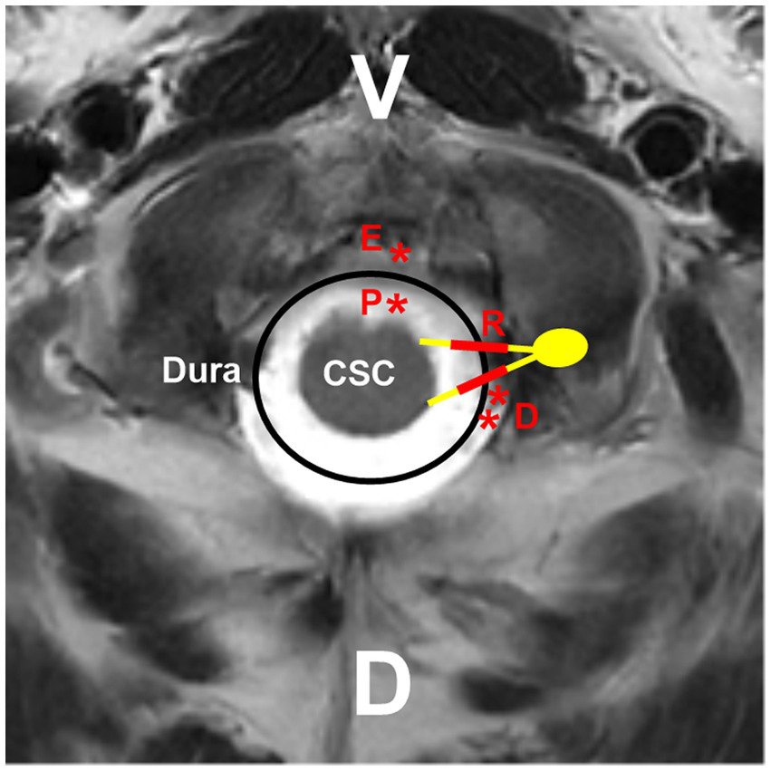 Locations of different high cervical CCJ AVFs. On the hybrid mode pattern of magnetic resonance imaging, the locations of different high cervical CCJ AVFs are shown. PAVF (red P with asterisk) located at the ventral spinal cord surface, RAVF (red R with thick line segments) located at C1-C2 nerves, DAVF (red D with double asterisks) located at the dorsal dura, EAVF (red E with asterisk) in ventral epidural space. AVF, arteriovenous fistula; C1-C2, first and second cervical vertebrae; CCJ, craniocervical junction; CSC, cervical spinal cord; D, dorsal; DAVF, dural AVF; EAVF, epidural AVF; PAVF, perimedullary AVF; RAVF, radicular AVF; V, ventral.