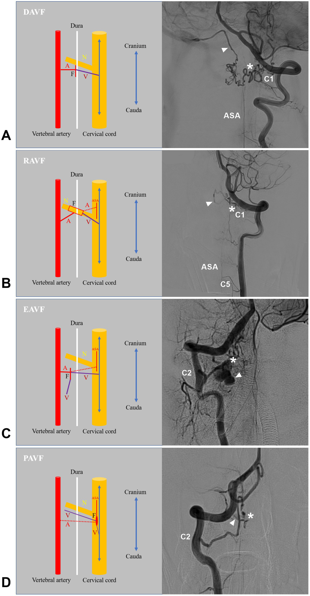 Types of high cervical CCJ AVFs. (A) Left panel showing the structure of DAVF in drawing, a radiculomeningeal artery and a radicular vein connected directly on dural sleeve of nerve root; Right panel showing the angioarchitecture of DAVF, the feeding artery was the C1 radicular artery, the asterisk indicated fistula point, and the arrowhead indicate the drainage into intracranial vein to sigmoid sinus. (B) Left panel showing the structure of the RAVF in drawing, a radicular (radiculomeningeal) artery and a radicular vein connected directly on the spinal nerve root. The ASA branch can be involved as the feeder (dotted line); right panel showing the angioarchitecture of the RAVF. The feeding artery was the C1 radicular artery, the asterisk indicates the fistula point, and the arrowhead indicates drainage into the intracranial vein. (C) Left panel showing the structure of the EAVF in the drawing. There is a direct arteriovenous shunt between the radicular and/or meningeal arteries and the epidural venous plexus. The ASA branch can be involved as the feeder (dotted line); right panel showing the angioarchitecture of the EAVF. The feeding artery is the C2 radicular artery, the asterisk indicates the fistula point, and the arrowhead indicates the drainage. (D) Left panel showing the structure of the PAVF in the drawing. The PAVF is a direct arteriovenous communication without an intervening nidus on the surface of the spinal cord; right panel showing the angioarchitecture of the PAVF. The feeding artery was the C2 radiculomedullary artery, the asterisk indicates the fistula point, and the arrowhead indicates the drainage. A, feeding artery; ASA, anterior spinal artery; AVF, arteriovenous fistula; C1, C2, and C5, first, second and fifth cervical vertebrae; CCJ, craniocervical junction; DAVF, dural AVF; EAVF, epidural AVF; F, fistula point; N, nerve; PAVF, perimedullary AVF; RAVF, radicular AVF; V, draining vein.