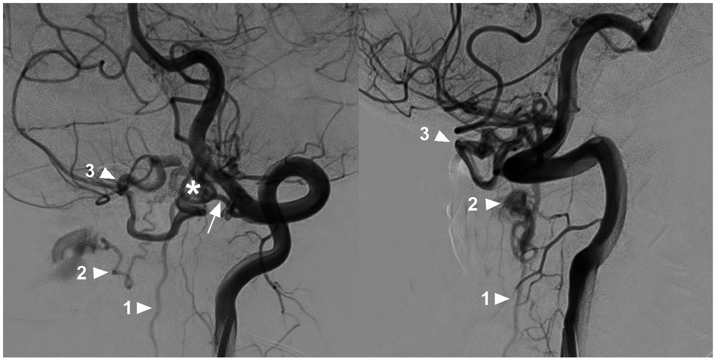 Multiple draining pathways in a high cervical CCJ AVF. Oblique-view DSA of the VA showing a CCJ AVF (asterisk in left panel) supplied by the C1 radicular artery (arrow in left panel); the drainage of the AVF had three pathways: downward into the perimedullary vein (arrowhead with number 1), lateral into the epidural venous plexus (arrowhead with number 2), and upward into the intracranial vein (arrowhead with number 3). AVF, arteriovenous fistula; C1, first cervical vertebrae; CCJ, craniocervical junction; DSA, digital subtracted angiography; VA, vertebral artery.