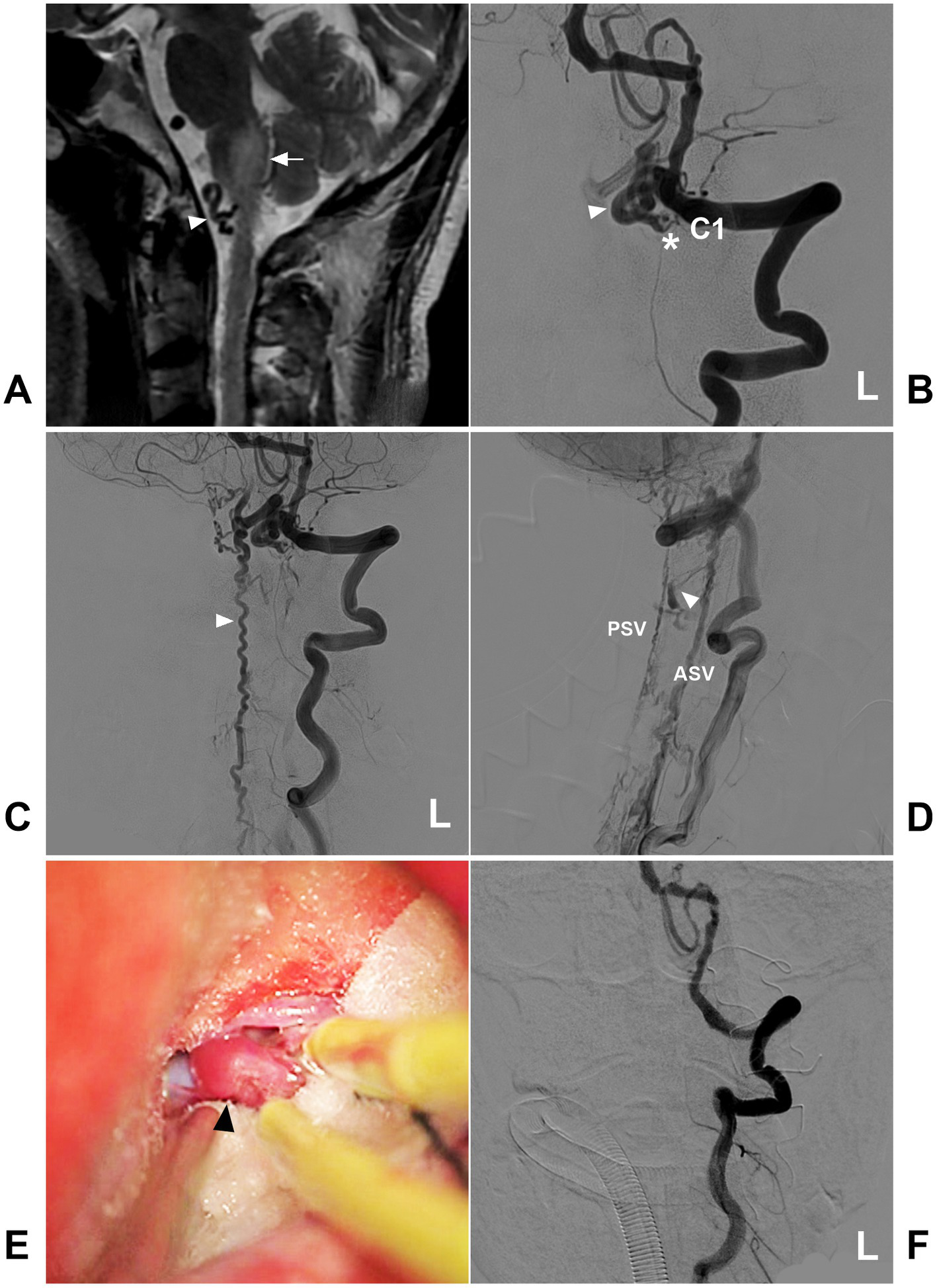 Open surgery in a high cervical CCJ DAVF with downward drainage. (A) MRI showing edema (arrow) of the medulla oblongata and abnormal vessels (arrowhead) in the front of the brainstem. (B) Arterial phase DSA of the left VA showing a CCJ DAVF (asterisk) fed by the C1 radicular artery. The drainage went into the intracranial vein (arrowhead). (C) Late arterial phase DSA of the anterior posterior view showing downward drainage into the perimedullary vein (arrowhead). (D) Late arterial phase DSA of the lateral view showing downward drainage, including downward ASV and PSV, and lateral drainage by the bridging and radicular veins (arrowhead). (E) Intraoperative image showing the thick arterialized draining vein (arrowhead). (F) Postoperative DSA showing that the DAVF was obliterated after the draining vein was coagulated and cut. ASV, anterior spinal vein; C1, first cervical vertebra; CCJ, craniocervical junction; DAVF, dural arteriovenous fistula; DSA, digital subtraction angiography; L, left; MRI, magnetic resonance imaging; PSV, posterior spinal vein; VA, vertebral artery.