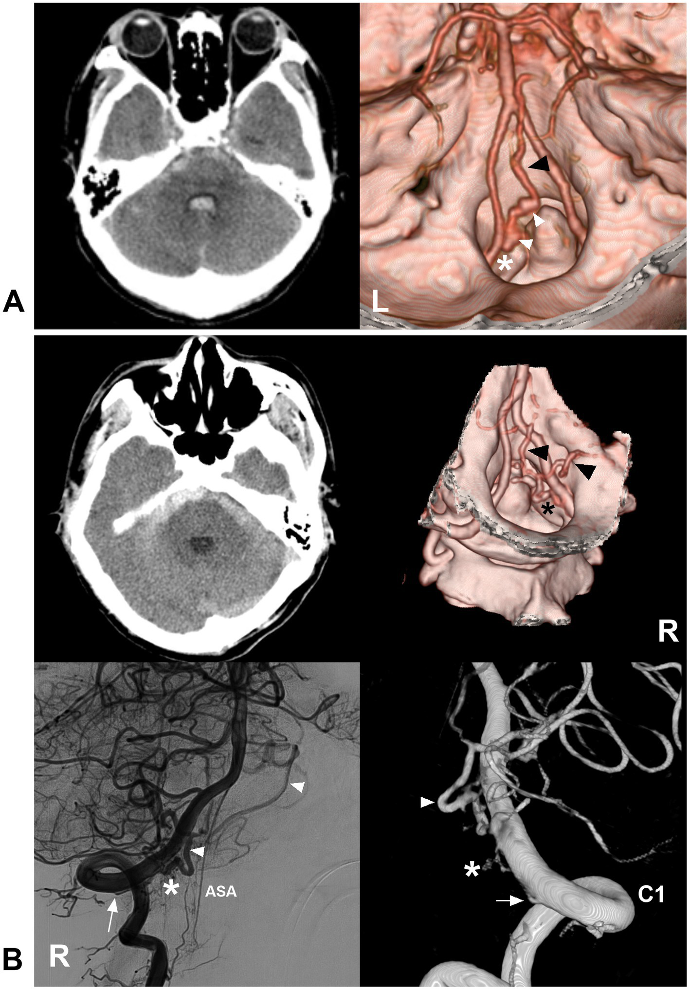 Ruptured CCJ AVF with upward drainage. (A) Left panel: CT showing subarachnoid hemorrhage and fourth ventricle hemorrhage; Right panel: CTA showing that a CCJ AVF (asterisk) had upward venous drainage (black arrowhead) with varices (white arrowheads). (B) Left upper panel: CT showing subarachnoid hemorrhage; right upper panel: CTA showing that a CCJ AVF (asterisk) had upward venous drainage (arrowheads); two-dimensional DSA (left below panel) and three-dimensional DSA (right below panel) showing a RAVF (asterisks) fed by the C1 radicular artery (arrows). The drainage went into the intracranial vein (arrowheads). AVF, arteriovenous fistula; C1, first cervical vertebrae; CCJ, craniocervical junction; CT, computed tomography; CTA, CT angiography; DSA, digital subtracted angiography; RAVF, radicular AVF.