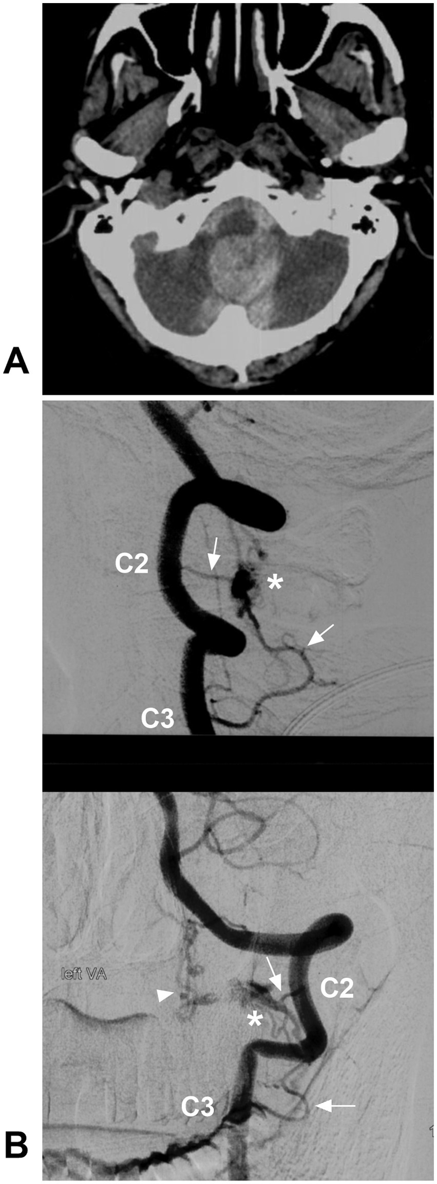 Ruptured CCJ RAVF with upward drainage. (A) CT showing subarachnoid and cisterna magna hemorrhage. (B) Lateral view (upper panel) and anterior posterior view (below panel) DSA of the VA showing an RAVF (asterisks) fed by the C2 and C3 radicular arteries (arrows) and with upward venous drainage (arrowhead in below panel). AVF, arteriovenous fistula; C2 and C3, second and third cervical vertebrae; CCJ, craniocervical junction; CT, computed tomography; DSA, digital subtracted angiography; RAVF, radicular AVF; VA, vertebral artery.