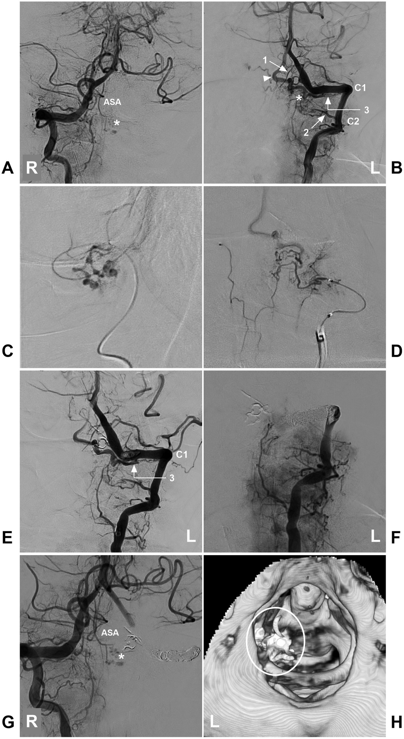 Incomplete EVT in a high cervical CCJ RAVF. (A) DSA of the left VA showing that the ASA supplied the AVF (asterisk). (B) DSA of the right VA showing that the AVF (asterisk) was fed by a brainstem perforating branch of the VA (arrow with number 1), the C2 (arrow with number 2) and C1 (arrow with number 3) radicular arteries, and the arrowhead indicates the draining vein. (C) Selective angiography of the brainstem perforating branch of the VA (arrow with number 1 in B) showing it to supply a part of the AVF. (D) Selective angiography of the C2 radicular artery (arrow with number 2) showing it to supply a part of the AVF. (E) After casting Onyx via two feeding arteries (numbers 1 and 2 in B), DSA of the left VA showing that the AVF was supplied by the C1 radicular artery (number 3 with arrow), confirming RAVF presentation. (F) DSA of the left VA showing that the VA was completely occluded by coiling, and the AVF could not be seen. (G) DSA of the right VA showing a part of the AVF (asterisk) was left. (H) Post-EVT CT reconstruction showing casting Onyx (ellipse), indicating the location of the RAVF. ASA, anterior spinal artery; AVF, arteriovenous fistula; C1-2, first and second cervical vertebrae; CCJ, craniocervical junction; CT, computed tomography; DSA, digital subtracted angiography; EVT, endovascular treatment; L, left; R, right; RAVF, radicular AVF; VA, vertebral artery.