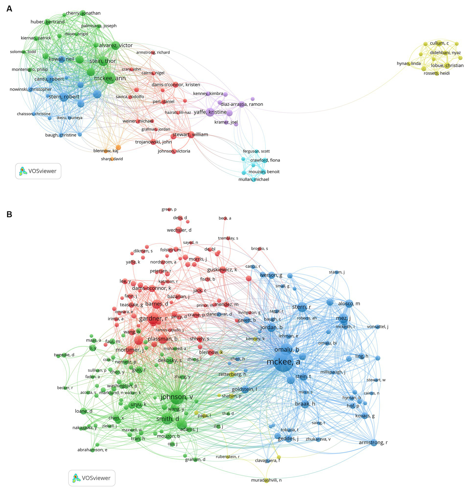 The study analyzed a total of 3,780 authors and 16,302 co-cited authors. We visualized the network analysis of the co-authorship of authors (Figure 5A) and the co-citation of cited authors (Figure 5B). Table 4 represents the 10 most productive authors and the top 10 co-cited authors with the best citations. The top 3 productive authors are McKee AC, Stein TD, and Stern RA, with 46, 33, and 28 papers, respectively. Interestingly, McKee AC holds first place both in terms of the number of publications and citations, who has 46 items, 5,418 citations, and an average citation rate of 117.8 citations per publication, making her the most prolific author in this discipline. Except for Yaffe, nine out of the top 10 productive scholars take office at Boston University, indicating the significance of this institution in the field. As for the co-cited authors’ network analysis, McKee AC, Johnson V, and Omalu B have the highest number of citations, and they also own the highest TLS scores, demonstrating their great contribution to this sector.