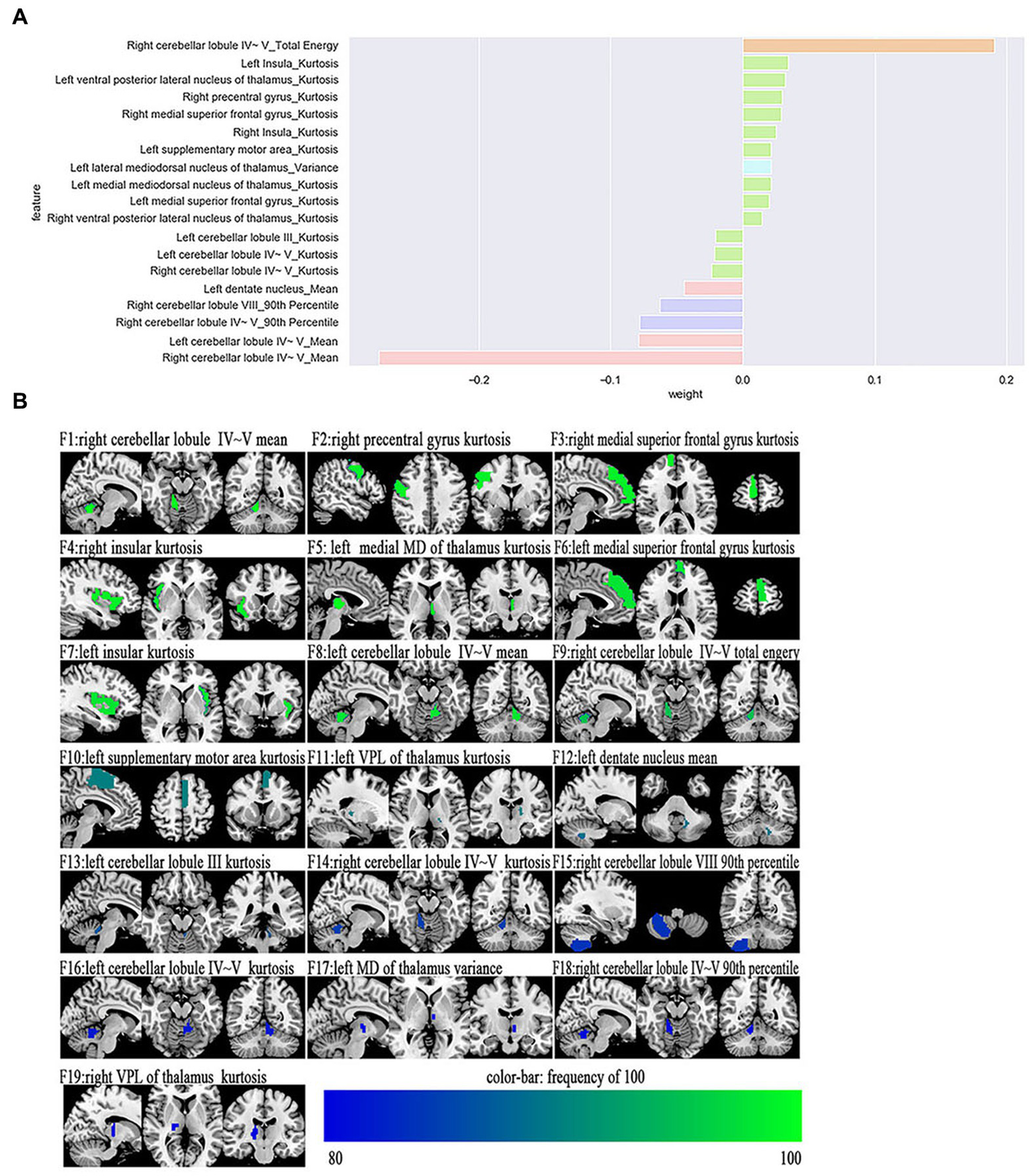 The most power-discriminative features were identified as features that were repeatedly selected ≥80% in the outer iteration, and these features were considered to be helpful for ET classification. A total of 19 features are reported (Table 3; Figure 2), including the left cerebellar lobule III (Cerebellum_3_L)kurtosis, left cerebellar lobule IV ~ V with two features, (Cerebellum_4_5_L)mean, (Cerebellum_4_5_L)kurtosis, respectively; right cerebellar lobule IV ~ V with four features, (Cerebellum_4_5_R)mean, (Cerebellum_4_5_R)total energy, (Cerebellum_ 4_5_R)kurtosis, (Cerebellum_4_5_R)90th percentile, respectively; right cerebellar lobule VIII (Cerebellum_8_R)90 Percentile; left medial mediodorsal nucleus of the thalamus (Thal_MDm_L)kurtosis; left lateral mediodorsal nucleus of the thalamus (Thal_MDl_L)variance; left ventral posterior lateral nucleus of the thalamus (Thal_VPL_L)kurtosis; right ventral posterior lateral nucleus of the thalamus (Thal_VPL_R)kurtosis; right precentral gyrus (Precentral_R)kurtosis; left medial superior frontal gyrus (Frontal_Sup_Med_L)kurtosis; right medial superior frontal gyrus (Frontal_Sup_Med_R)kurtosis; left insula (Insula_L)kurtosis; right insula (Insula_R)kurtosis; left supplementary motor area (Supp_Motor_Area_L)kurtosis; and left dentate nucleus (dentate_L)mean.