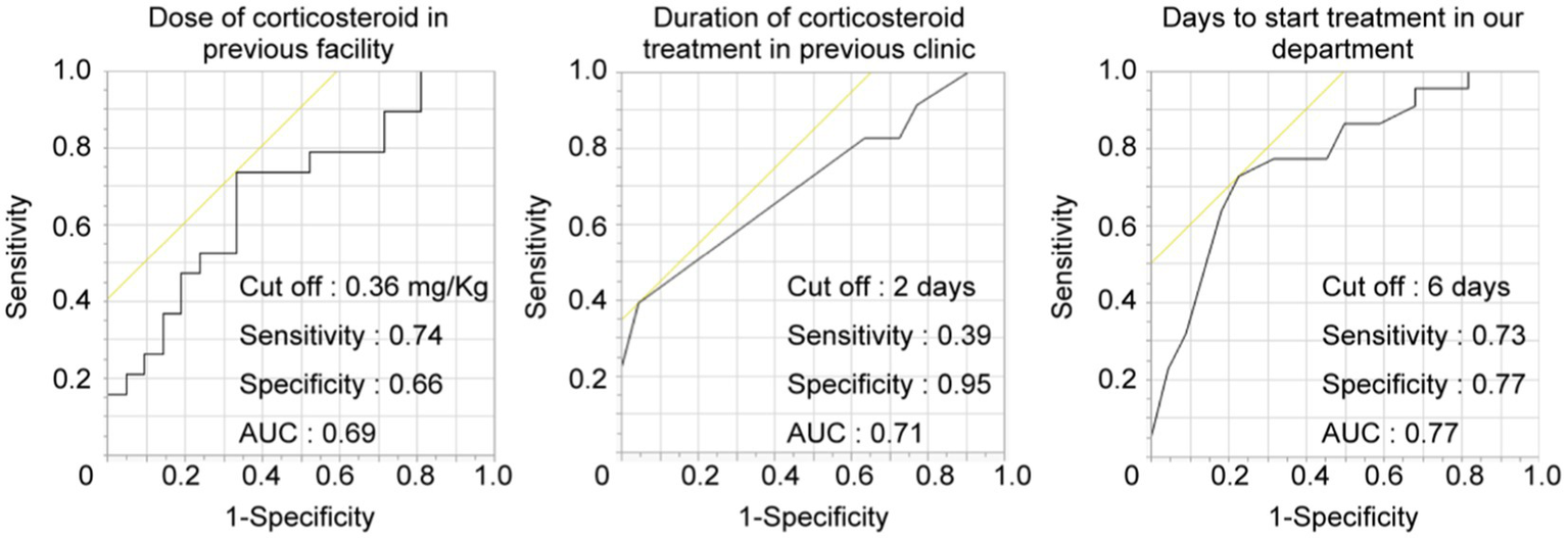 These results revealed that the timing and dose of corticosteroid administration at the previous clinic affected the prognosis of ISSHL. Therefore, we further calculated the cut-off value from the ROC curve to elucidate the effect of primary corticosteroid administration at the previous clinic. Cut-off values of the corticosteroid dose were 0.36 mg per kg of body weight (sensitivity: 0.74, specificity: 0.66, area under the curve [AUC]: 0.69), the duration of administration at the previous doctor was 2 days (sensitivity: 0.39, specificity: 0.95, AUC: 0.71), and the start date of re-initiation at our department was 6 days from the onset (sensitivity: 0.73, specificity: 0.77, AUC: 0.77) (Figure 2).