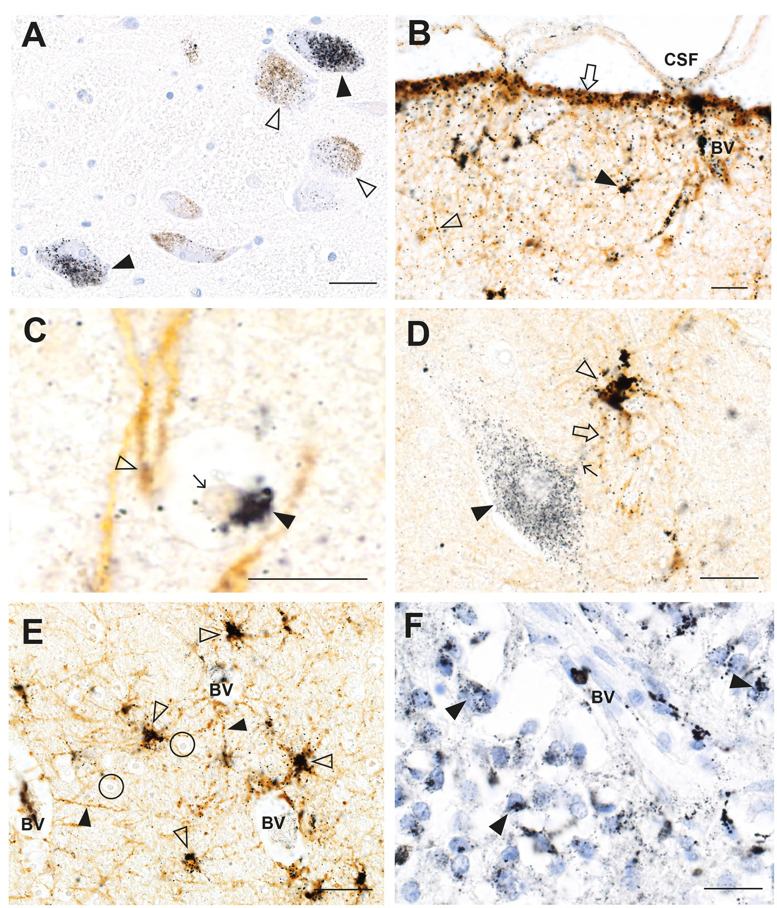 Mercury in the brain after exposure to inorganic mercury. (A) Dense black AMG™ staining is seen in two locus ceruleus neurons (closed arrowheads) and scattered in the neuromelanin pigment in another two neurons (open arrowheads). (B) In the frontal cortex, AMG™ (combined with brown GFAP immunostaining) are present in the frontal lobe brown glia limitans (arrow) below the cerebrospinal fluid (CSF), in brown subpial astrocyte cell bodies (closed arrowhead), in brown astrocyte processes (open arrowhead), and in blood vessel walls. (C) In the frontal cortex, AMG™ (closed arrowhead) are seen in an oligodendrocyte cell body adjacent to the nucleus (thin arrow). The GFAP-stained brown descending branch of an interlaminar astrocyte makes contact (open arrowhead) with the oligodendrocyte. (D) In the frontal cortex, AMG™ are seen in the cell body of a corticomotoneuron (closed arrowhead), a dendrite (small arrow), a GFAP-stained brown connecting astrocyte process (large arrow), and largely obscuring the brown astrocyte cell body (open arrowhead). (E) In the frontal white matter, GFAP-stained brown fibrous astrocyte cell bodies (open arrowheads) and processes (closed arrowheads) contain AMG™. No AMG™ are seen in oligodendrocytes (in circles). (F) In the pineal gland, AMG™ are present in most pinealocytes (closed arrowheads) and in blood vessel walls. BV blood vessel. Methods: A–E adapted from (23), F from (25). Bars = 20 μm.