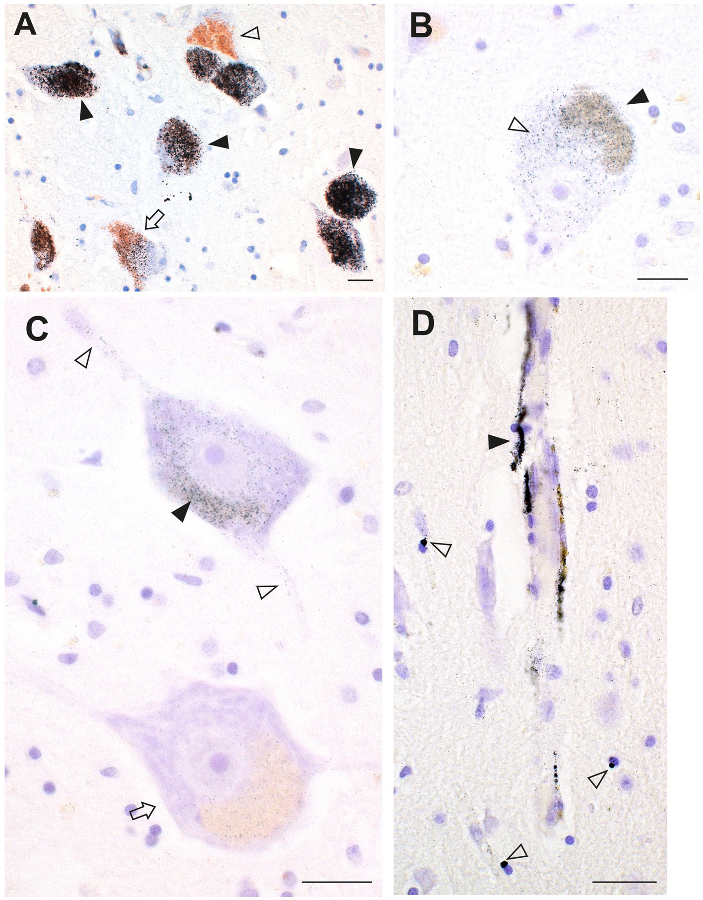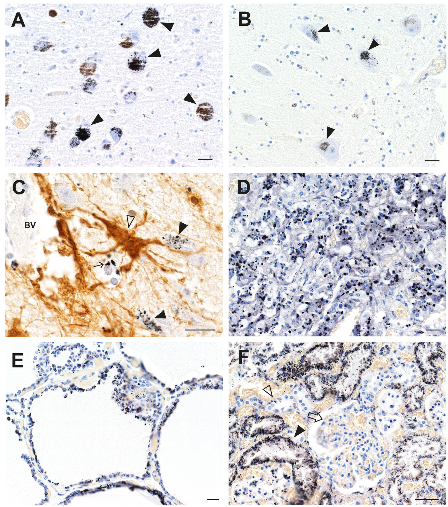 When sections from the brain of a man who died suddenly and unexpectedly were examined with autometallography, silver (confirmed on LA-ICP-MSI) was found in widespread brain regions (26). Cells containing most silver were locus ceruleus neurons, white (not grey) matter oligodendrocytes, blood vessel walls in the anterior pons and lateral geniculate nuclei (with less staining in microvessels in white matter elsewhere), white matter astrocytes, cerebellar dentate neurons, brain stem raphe neurons, ependymal cells, and neurons and glial cells adjacent to medium-sized venules in the leptomeninges, especially those deep in the lateral occipitotemporal gyrus of the inferomedial temporal lobe (Figure 4).