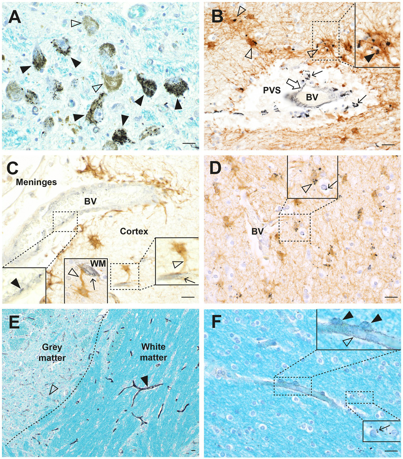 Toxic metals in MS brains. (A) In the locus ceruleus, black AMG™ grains are seen in most neurons (closed arrowheads). Some neurons contain no AMG™ (open arrowheads). (B) In the pontine white matter, small AMG™ deposits are seen in the wall of a blood vessel (open arrow) and in surrounding macrophages (thin arrows) in the perivascular space (PVS). GFAP-immunostained brown fibrous astrocytes (open arrowheads) near the blood vessel contain AMG™. Inset: magnified view of an astrocyte containing AMG™ (closed arrowhead). (C) In the cerebral cortex, a small leptomeningeal blood vessel (BV) contains AMG™ in its wall (left magnified inset, closed arrowhead). Right magnified inset: a microvessel within the cortex contains AMG™ (arrow), with an adjacent GFAP-stained brown astrocyte cell body connected via a hypertrophic process (open arrowhead). Middle inset: a white matter (WM) AMG™-containing microvessel (arrow) connects to an astrocyte cell body via a hypertrophic astrocytic process (open arrowhead). (D) In the cerebral white matter, oligodendrocytes (arrow) and GFAP-stained brown astrocytes (open arrowhead) adjacent to a blood vessel contain AMG™ (magnified in inset). (E) Pontine white matter microvessels (closed arrowhead) contain more AMG™ than grey matter microvessels (open arrowhead). (F) In the frontal white matter, AMG™ are seen in a microvessel wall (open arrowhead) and in surrounding pericytes (closed arrowheads in magnified upper inset). Lower magnified inset: scattered oligodendrocytes have small AMG™ deposits (arrow). BV blood vessel. Methods: A–F adapted from (26). Bars = 20 μm.
