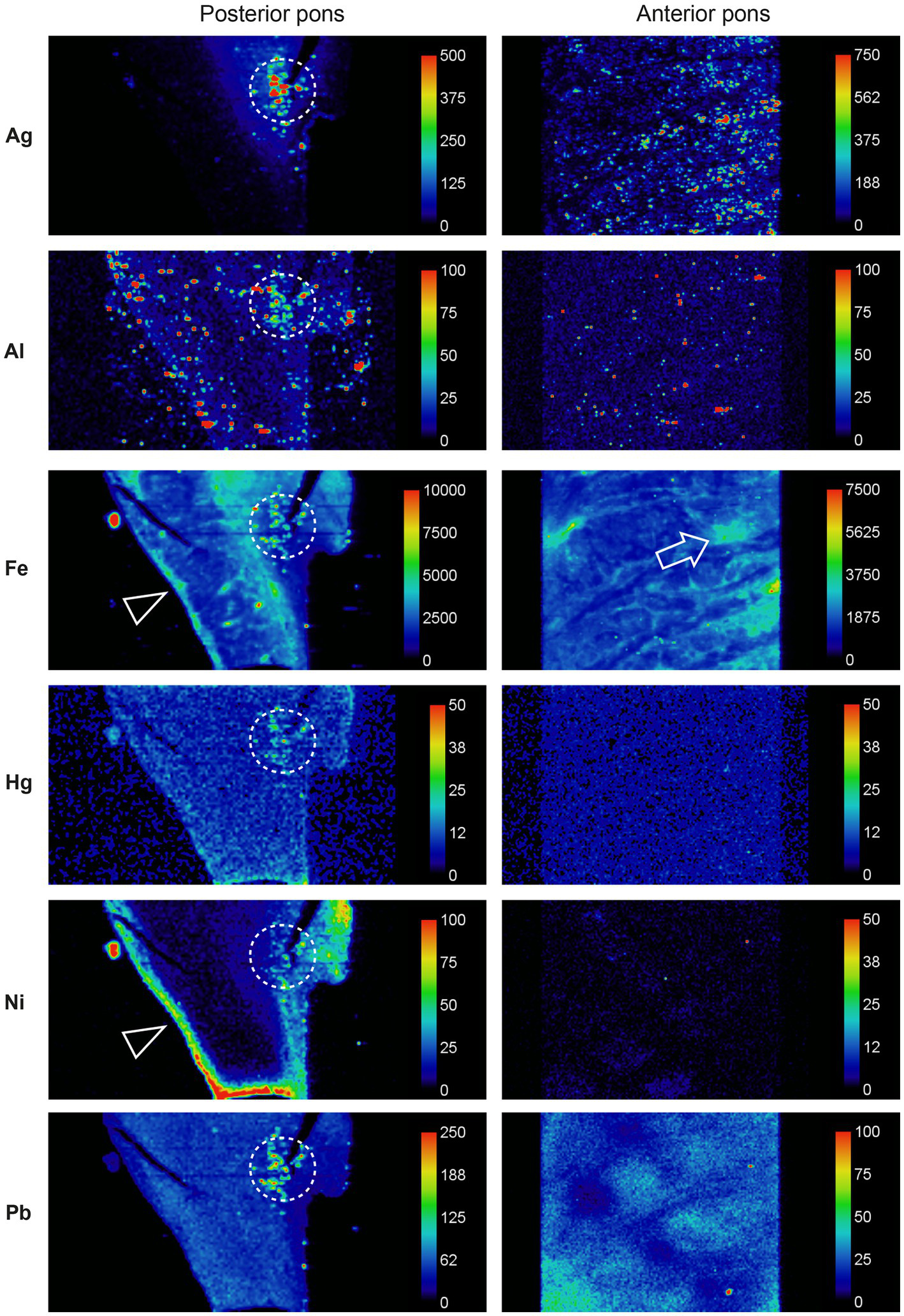 Toxic metals in the pons of a person with MS. Posterior pons: metals present in the locus ceruleus (within dashed circles) are silver, aluminium, iron, mercury, nickel, and lead. Iron and nickel are seen in subpial regions adjacent to the cerebrospinal fluid (arrowheads). Anterior pons: silver, iron and lead are present in white matter regions, and iron around blood vessels (arrow). Methods: adapted from (26).