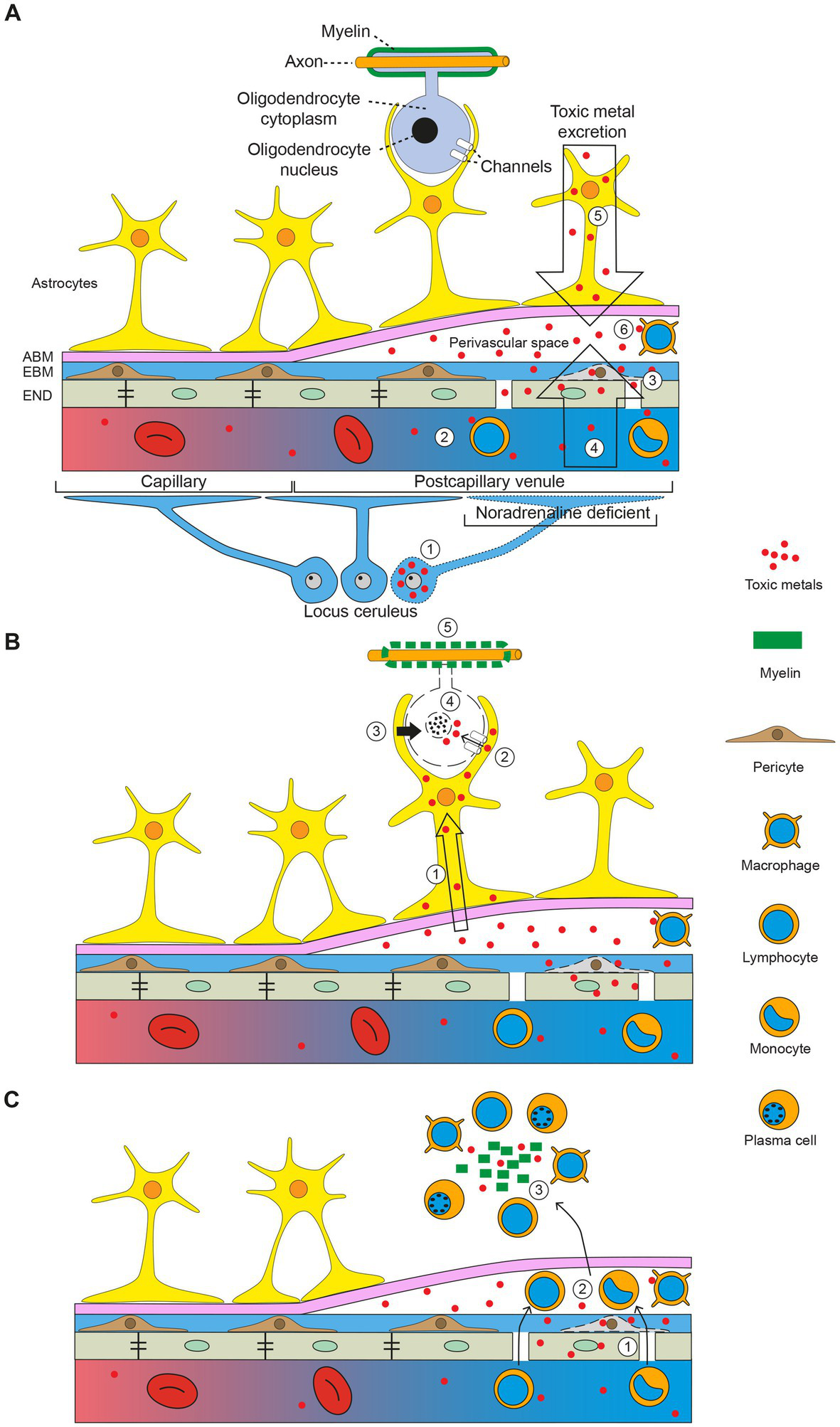 The demyelinated plaques of MS are usually located around venules, which has prompted studies of reactions in the perivascular space that could give rise to demyelination (157). A potential role for toxic metal uptake in the perivascular space in MS, aided by toxic damage to locus ceruleus neurons impairing the blood–brain barrier, is illustrated in the diagram in Figure 7. This shows how toxic metals can enter the perivascular space, and then enter astrocytes and oligodendrocytes. This triggers oligodendrocyte apoptosis and secondary autoimmune inflammation, with demyelination causing a clinical attack of MS.
