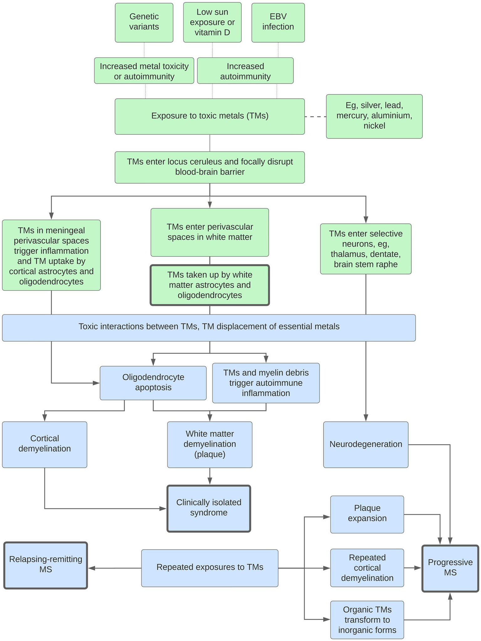 All four neurological disorders under consideration have progressive phases, though MS is usually remitting–relapsing in its early stages (2). Exposure to toxic metals such as mercury is often from organic forms (such as from consumption of predatory fish such as sharks) which can pass through the blood–brain barrier and enter the brain (145). Organic mercury is slowly converted to more toxic inorganic mercury in the brain (44), which could be behind the slow progression of neurodegenerative diseases. Furthermore, toxic metals can cause protein conformational changes (114, 115), which could then slowly spread the disorder to other connected cells (121).