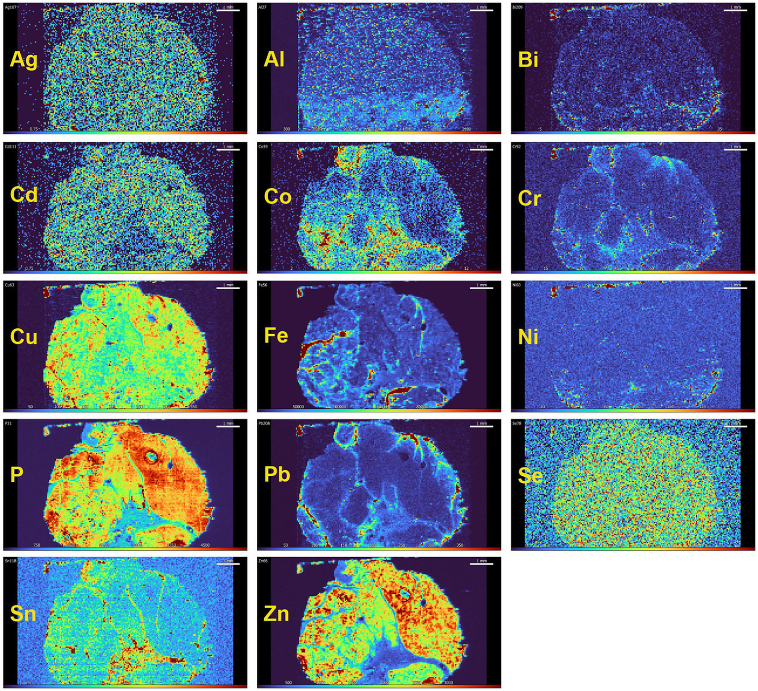 LA-ICP-MSI of pons paraffin sections from all MS patients and 12 controls showed that combinations of iron, silver, lead, aluminium, mercury, nickel, and bismuth were present more often in the locus ceruleus of MS patients than controls and were located predominantly in white matter tracts (Figure 6).