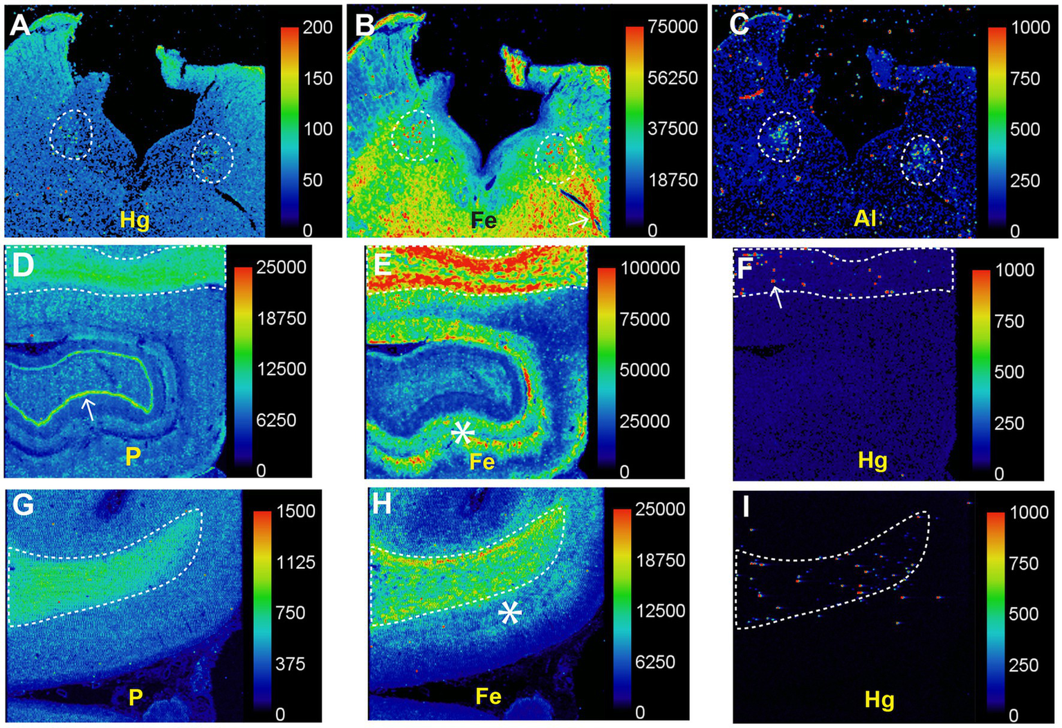 Toxicants usually appear in only small numbers of cells of the brain, so one cannot use bulk chemistry to detect them due to the dilution effect of the non-toxicant containing cells. Fortunately, there are elemental bioimaging methods that can get around this problem, such as neutron activation analysis that can measure many metals with high sensitivity and specificity (29). Another method is autometallography (AMG), a silver-based technique that can detect very small amounts of inorganic mercury, silver, and bismuth within cells (30, 31). AMG can be supplemented by laser ablation-inductively coupled-mass spectrometry imaging (LA-ICP-MSI) which can detect a large array of elements within cells and tissues, though at a lower resolution than autometallography (26). Using AMG and LA-ICP-MSI together gives a good picture of toxicant distribution within human brains. Another technique, synchrotron X-ray fluorescence microscopy, gives excellent cellular resolution for multiple elements (24), but requires frozen tissue and very small sample sizes, making it unsuitable for large-scale human brain-based projects.